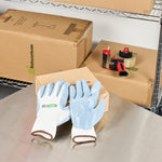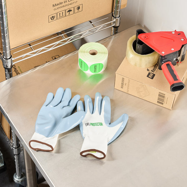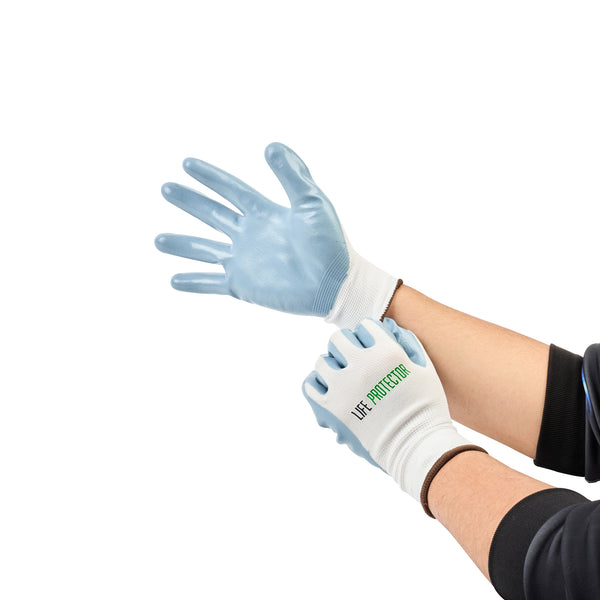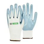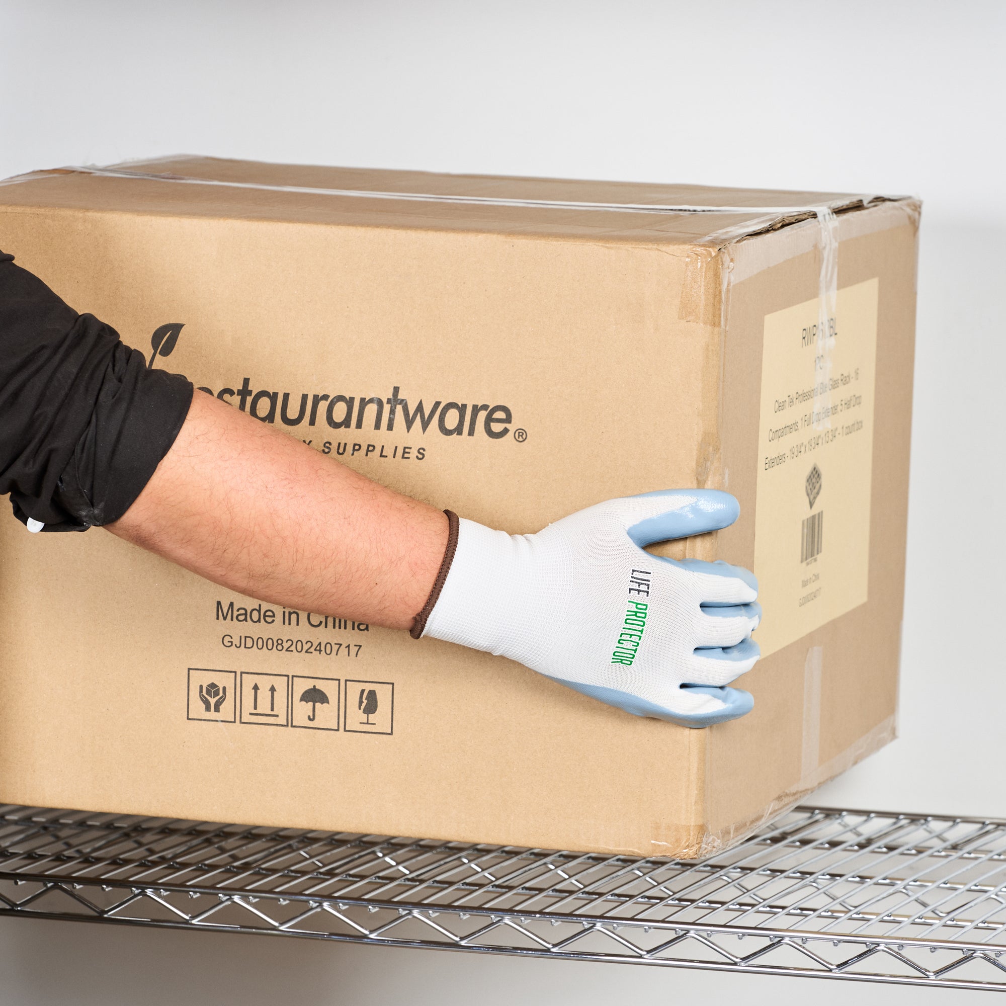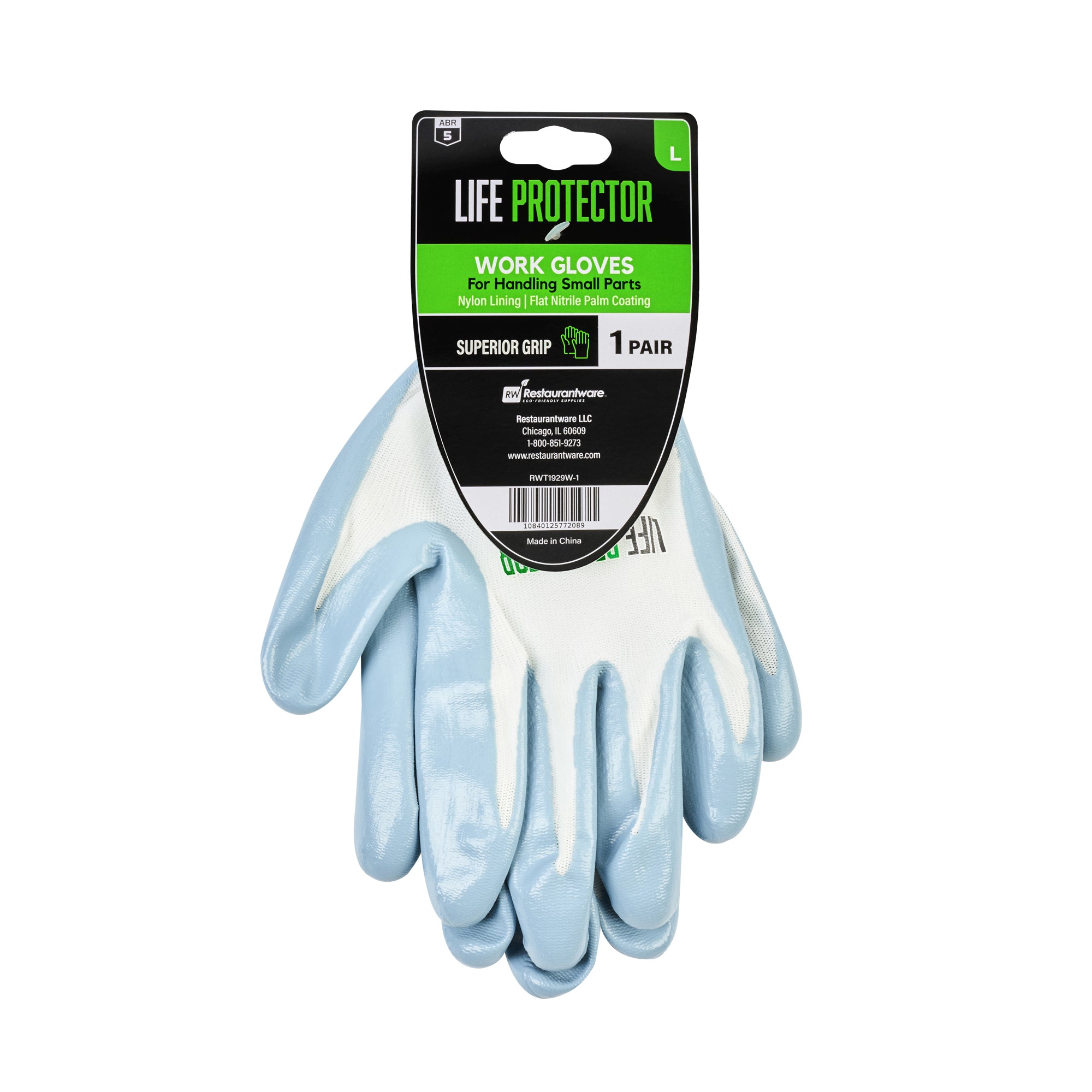 Equip your team with our Life Protector White Nylon Large Work Gloves. These heavy-duty gloves feature a flat nitrile palm coating that is resistant to abrasions and tears for long-lasting use. Designed to ensure you maintain control in various work conditions, these protective gloves provide superior grip on both dry and wet surfaces. The breathable nylon lining of these white work gloves helps keep your hands cool and comfortable during extended wear. With a 13-gauge thickness, these work gloves offer an added layer of protection while working in tough environments. Perfect for handling small parts, these mechanic gloves boast fine grip and dexterity, making them ideal for detailed assembly and repair work. For easy upkeep, these white gloves are hand washable, ensuring they remain in top condition. The crisp white color of these hand protection gloves gives them a neat look. Measuring 9.75 inches in length by 4.25 inches in width, these hand gloves provide a snug fit for optimal functionality. Each order includes 10 pairs of large work gloves.