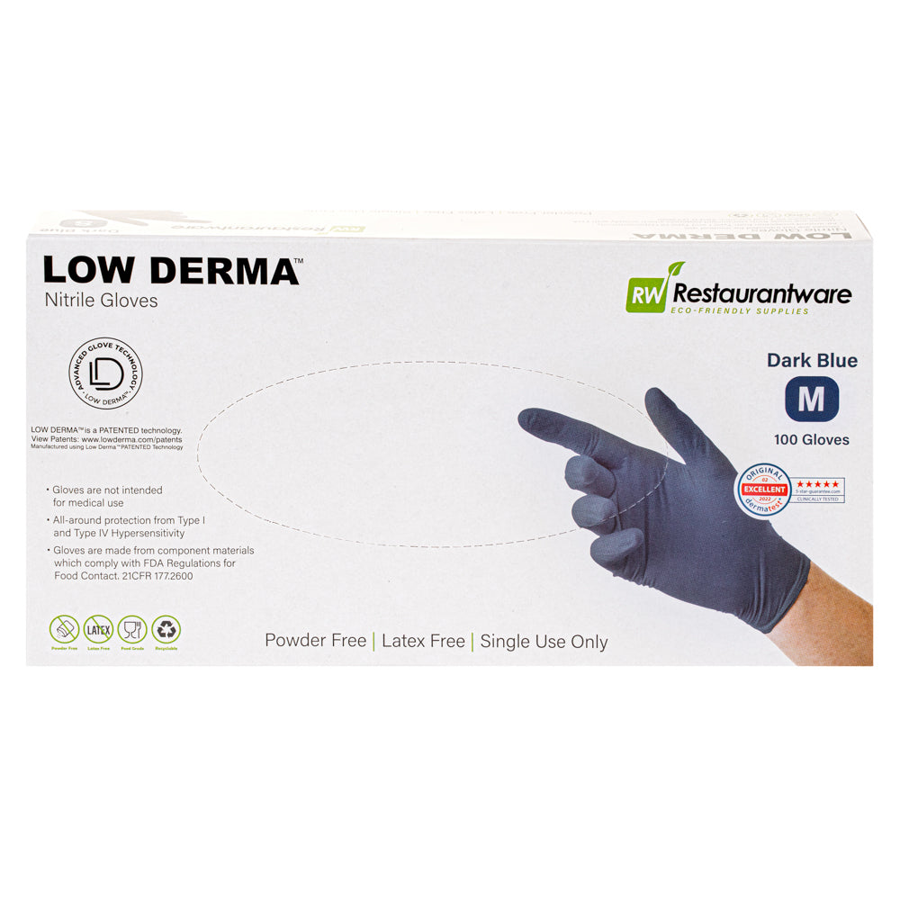 Securely prepare meals with our LOW DERMA™ Dark Blue Medium Nitrile Gloves. Crafted from nitrile, these disposable cooking gloves are both food-grade and compliant with FDA regulations to keep unwanted substances out of food. Made with LOW DERMA™ technology, these hypoallergenic gloves have a Dermatest ® 5-star seal certification and, are latex-free and powder-free to help reduce the potential for allergic reactions or hypersensitivity. These low dermatitis potential gloves provide all-around protection from Type I and Type IV hypersensitivity. For left and right-handed staff to work comfortably, these food-grade gloves are ambidextrous. With textured fingertips, these nitrile gloves provide a secure grip to keep food from accidentally slipping from your hands. To match your employees' uniforms, these textured gloves have a dark blue finish. The dispensing box that comes with these nitrile gloves allows you to easily store and access them. To avoid washing gloves in the washing machine, these janitorial gloves are disposable. These non-sterile gloves do not contain natural rubber latex, sulfur, or accelerators. These latex-free gloves are medium in size. Sold in a 100 count box. Gloves are not intended for medical use.