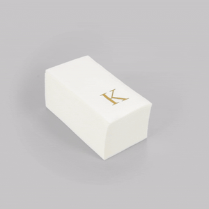 Enhance your dining experience with elegant, disposable napkins. Luxenap Rectangle Gold Letter K White Paper Linen-Feel Guest Towel / Napkins offer a plush, linen-like texture thanks to their premium air-laid paper construction, ensuring guests enjoy the comfort of a cloth napkin without the inconvenience of laundering. The sophisticated gold ‘K’ monogram adds a personalized touch to table settings, making these linen-feel napkins ideal for upscale restaurants and special events. With generous dimensions of 15.75 inches by 7.87 inches, these napkins provide ample coverage and superior absorbency to effectively manage spills, ensuring a clean and polished presentation. Their compact folded size ensures efficient storage, streamlining operations in busy foodservice environments. The disposable design of these napkins allows for quick cleanup, perfect for high-volume events and catering services. Sold in a 50 count box.