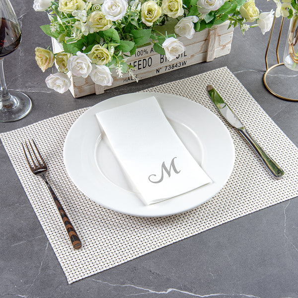 Elevate your dining experience with a touch of elegance. Luxenap Rectangle Silver Letter M White Paper Linen-Feel Guest Towel / Napkins provide a luxurious alternative to conventional options, featuring a generous 15.75 inches by 7.87 inches size that enhances guest satisfaction. Crafted from premium air-laid paper, these disposable napkins boast exceptional absorbency to efficiently tackle spills, ensuring tables remain pristine throughout service. Their elegant silver lettering adds a sophisticated touch, making them ideal for upscale events and settings. These airlaid napkins are not only absorbent but also biodegradable, supporting environmentally conscious practices in your establishment. Upgrade your table settings effortlessly and impress customers looking for linen-feel napkins that combine functionality with style. Sold in a 50 count box.