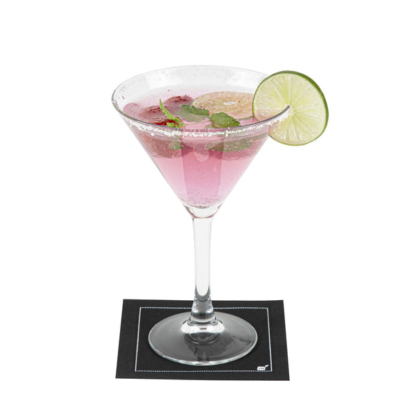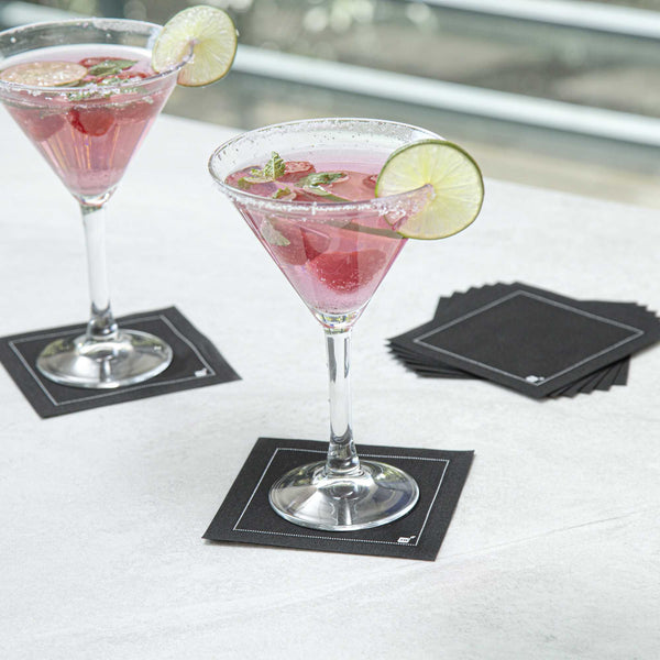 Made from organic cotton, these cloth cocktail napkins offer an nature-friendly and luxurious alternative to paper napkins. Their premium cotton construction offers unparalleled strength and durability, while their sophisticated linen-like feel provides guests with ultimate comfort and convenience. Measuring 4.5 inches by 4.5 inches, these black cloth cocktail napkins are designed with elegant taupe stitching to accentuate any tablescape for any occasion. Serve these fabric cocktail napkins alongside freshly shaken cocktails at an upscale catered event -- or use them as conveniently disposable, yet lavishly luxurious beverage napkins at a trendy wine bar or bustling bistro. These beverage napkins are carefully packaged to ensure that they arrive pressed and unwrinkled for service. We offer these cloth cocktail napkins in a 50 count box.