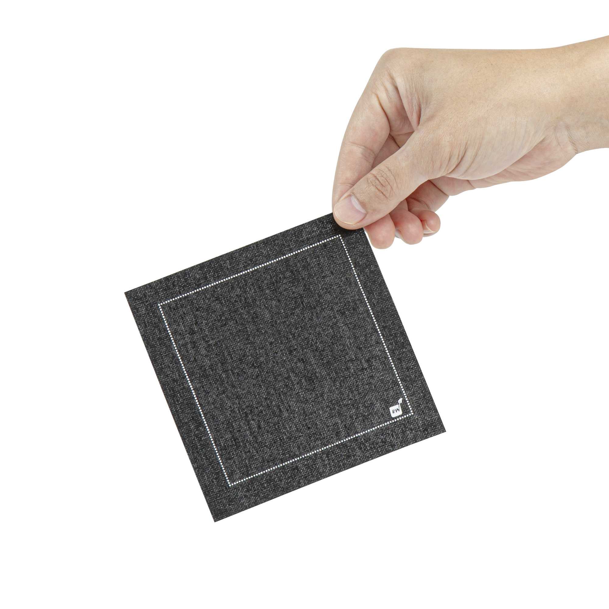Made from organic cotton, these cloth cocktail napkins offer an nature-friendly and luxurious alternative to paper napkins. Their premium cotton construction offers unparalleled strength and durability, while their sophisticated linen-like feel provides guests with ultimate comfort and convenience. Measuring 4.5 inches by 4.5 inches, these black cloth cocktail napkins are designed with elegant taupe stitching to accentuate any tablescape for any occasion. Serve these fabric cocktail napkins alongside freshly shaken cocktails at an upscale catered event -- or use them as conveniently disposable, yet lavishly luxurious beverage napkins at a trendy wine bar or bustling bistro. These beverage napkins are carefully packaged to ensure that they arrive pressed and unwrinkled for service. We offer these cloth cocktail napkins in a 50 count box.