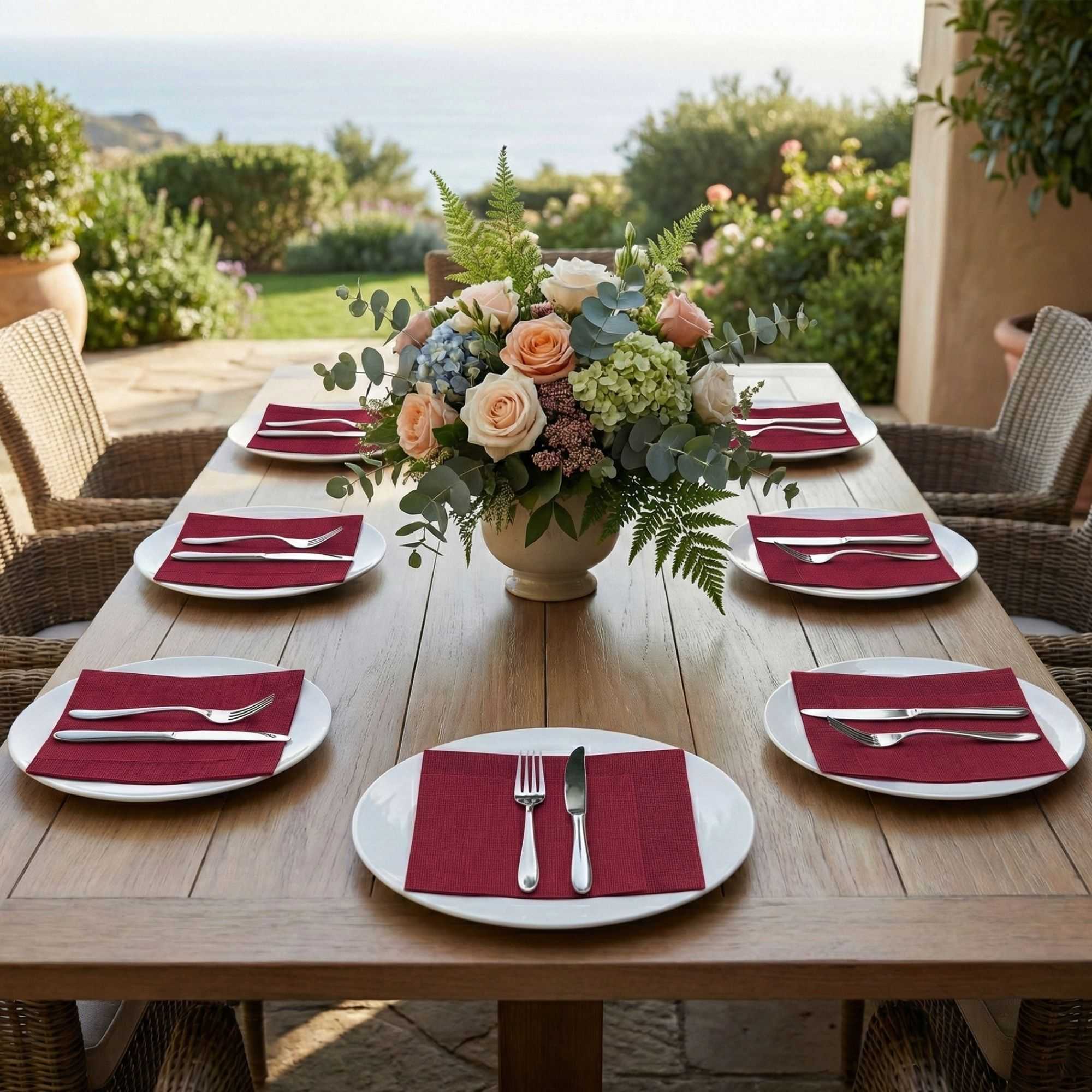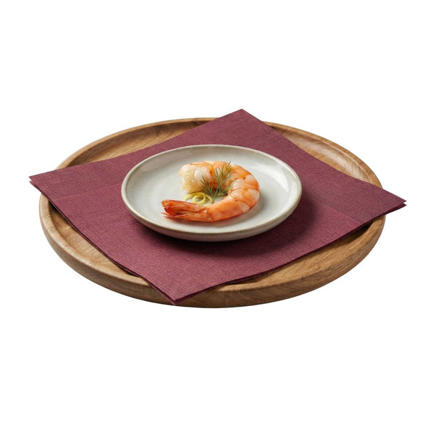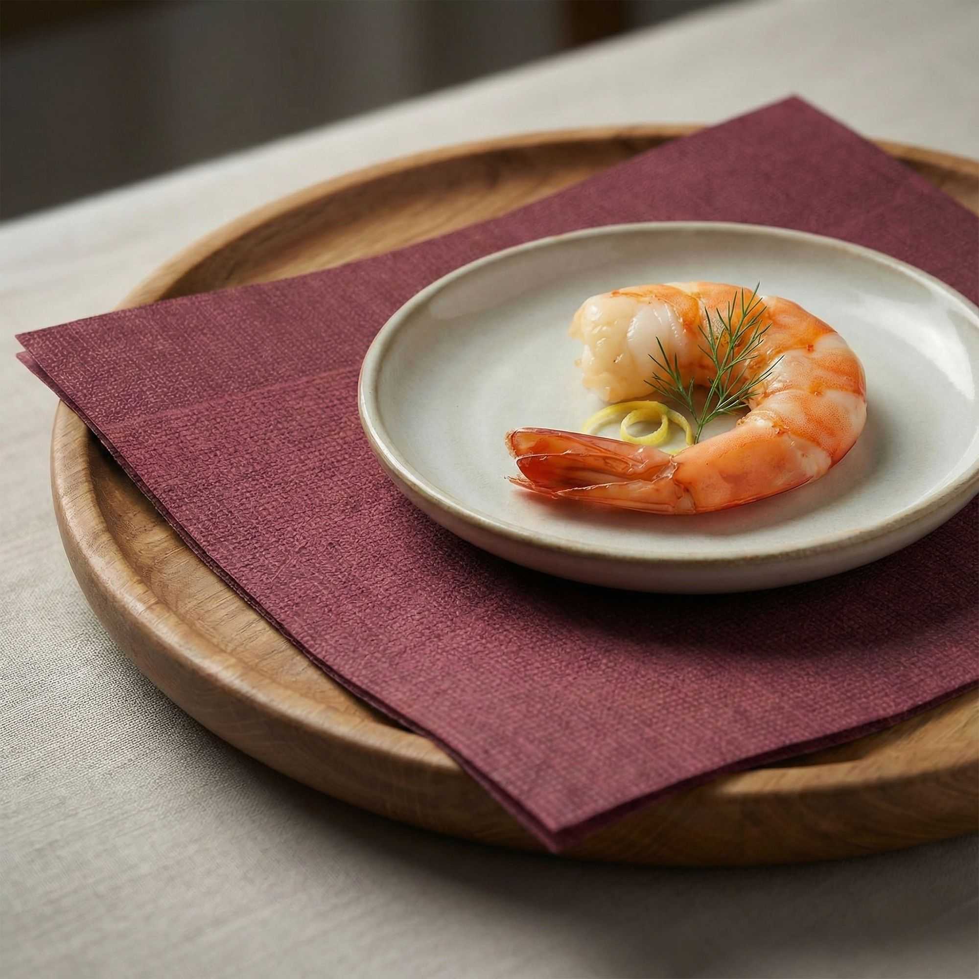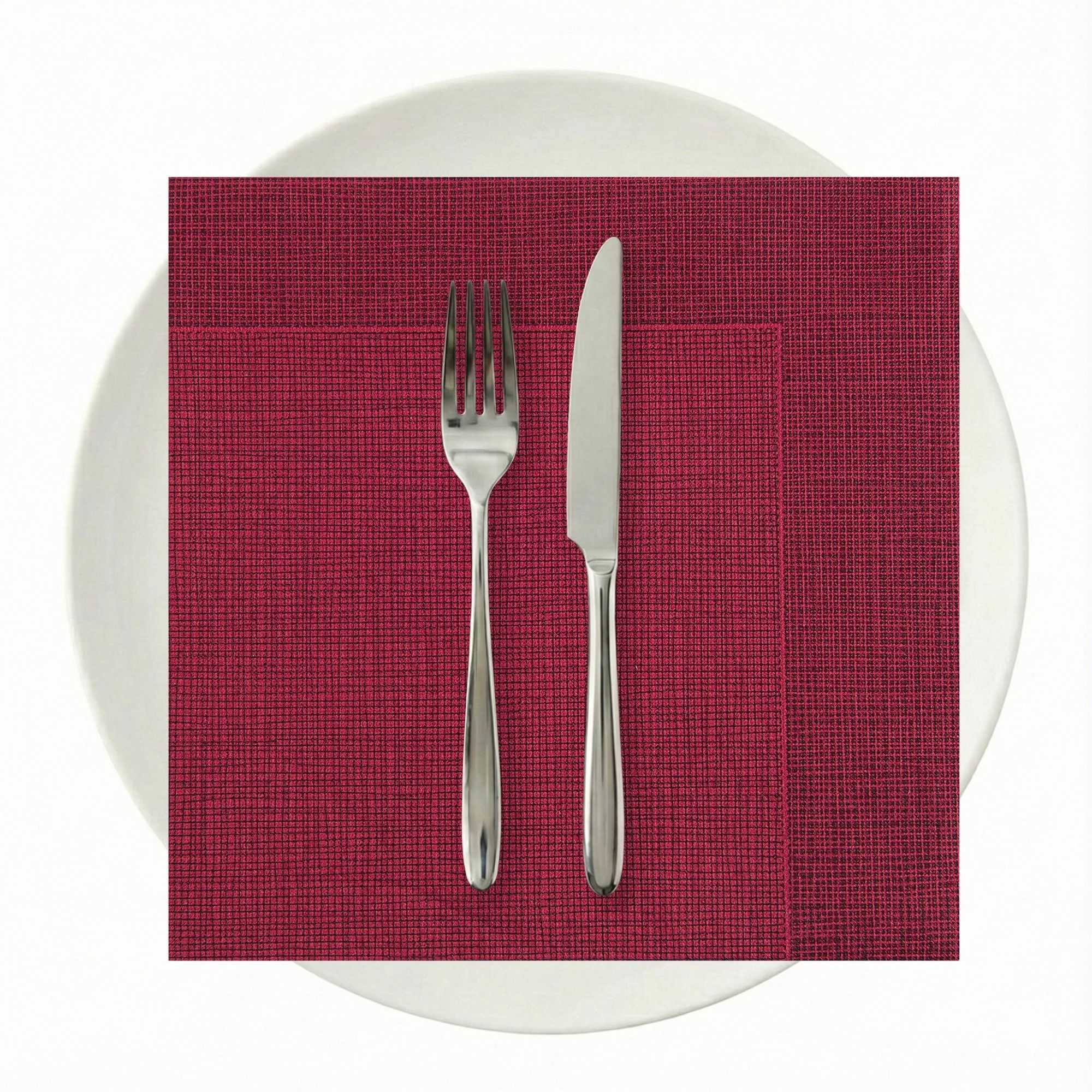 Our line of Luxenap Air Laid Disposable Napkins is designed to mimic the elegant look and sumptuous feel of linen napkins, while offering the convenient disposability and excellent absorbability of paper napkins. Use these high-quality paper napkins to quickly and easily reset tables at a bustling bistro, or to effortlessly enhance the look of disposable tableware at an upscale catered event. Designed to keep your guests' laps protected and their clothing pristine, these air laid paper napkins are non-linting and static-free. These plush bordeaux napkins are accented with an intricate black-threaded design that looks as great at a ritzy steakhouse as it does at a trendy wine bar. Measuring 16 inches by 16 inches when unfolded, these burgundy paper napkins will arrive pre-folded in ready-to-use 8-inch by 8-inch squares. Browse our extensive selection of disposable flatware and tableware to complete the look! Sold in a 25 count box.