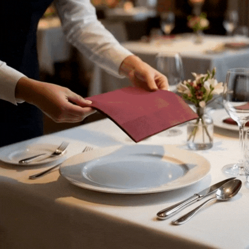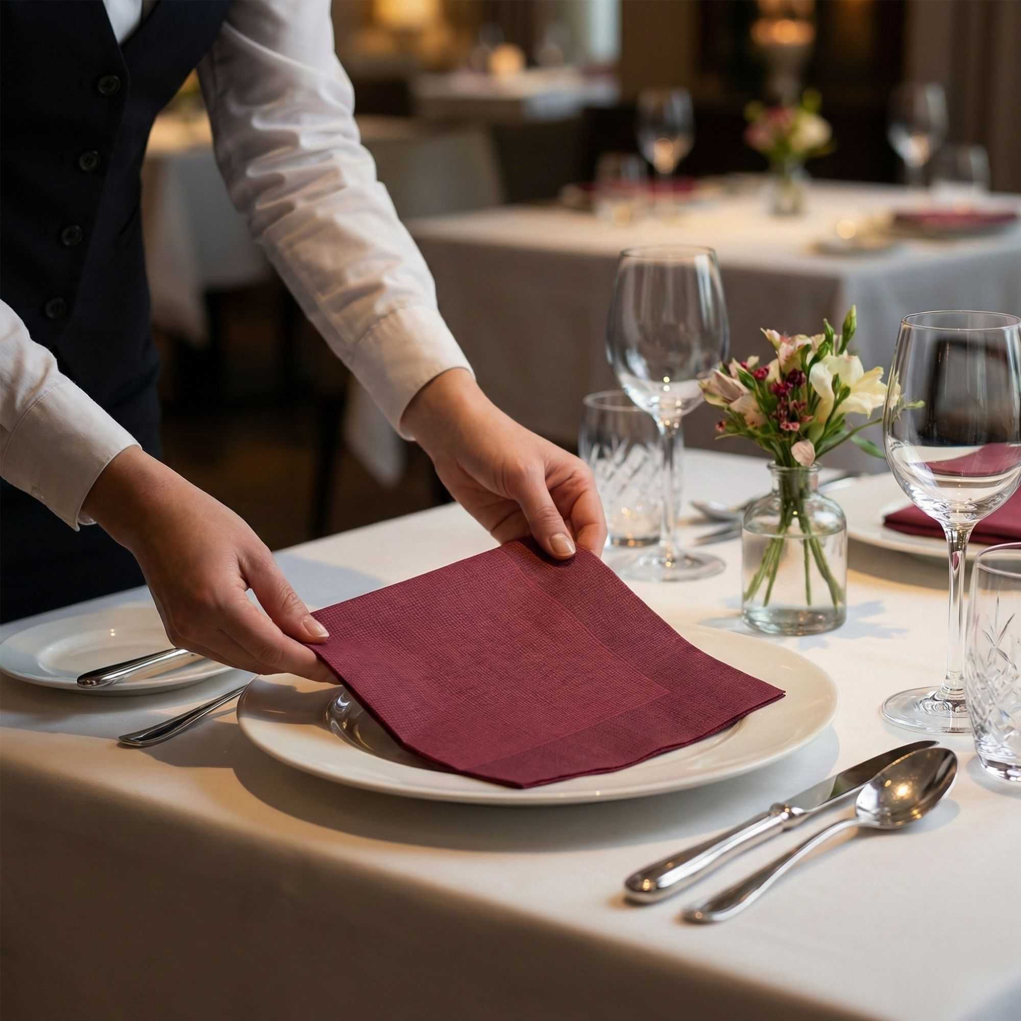 - Pre-folded napkins wrap around cutlery to easily set tables