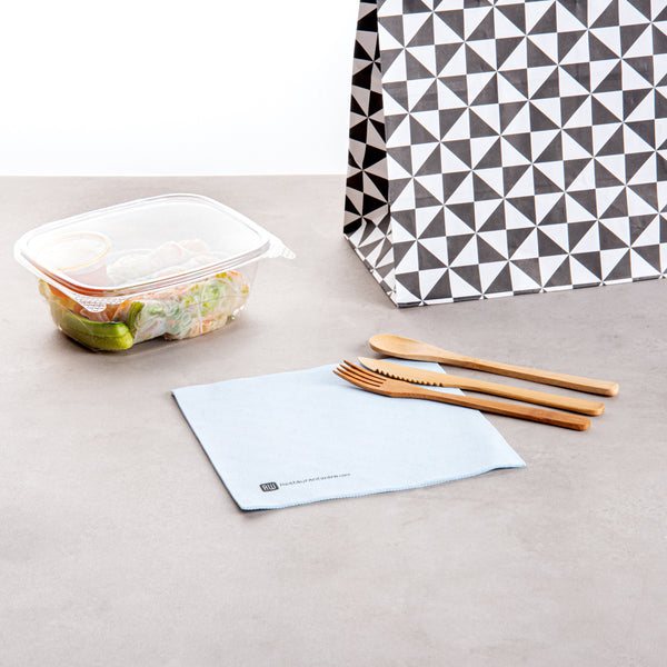 - Pre-folded napkins wraps around cutlery to easily reset tables