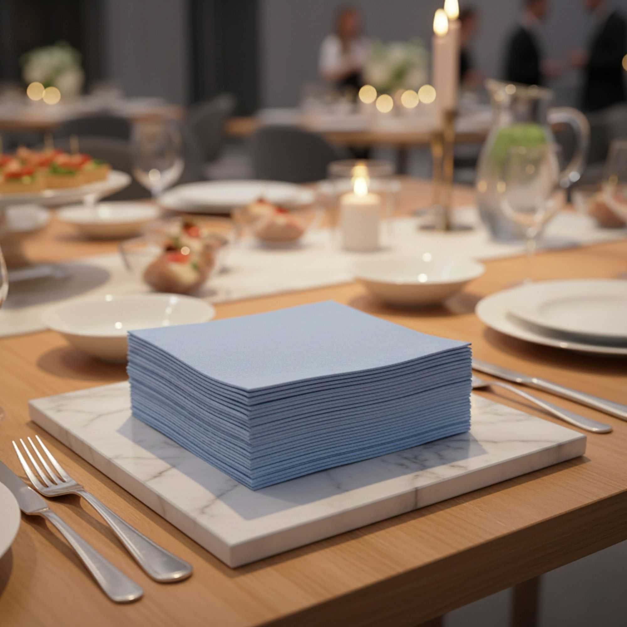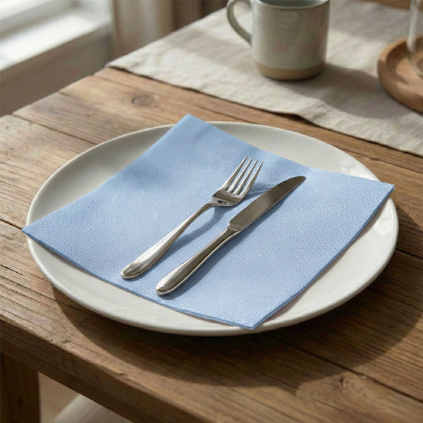 Our Luxenap Air Laid Disposable Napkins combine the convenience of disposable paper napkins with the luxurious soft touch of linen napkins. Crafted from premium air laid paper, these linen-feel disposable napkins are superbly soft and extremely absorbent. Their textile-like surface has the elegant drape and feel of linen, while their non-linting and static-free design ensures clothes stay pristine and protected. Measuring a large 16 inches by 16 inches when unfolded, these linen-like paper dinner napkins will arrive conveniently pre-folded into ready-to-use 8 inch by 8 inch squares. Use these high-quality paper napkins as stylish luncheon napkins at catered events and corporate functions, or use them as linen-like napkins for wedding receptions and other special events! Featuring a striking denim-inspired light blue print, these linen-like napkins add a refreshing pop of color to any tablescape for any occasion. Sold in a 600 count box. Note: A small Restaurantware logo is printed on each napkin.