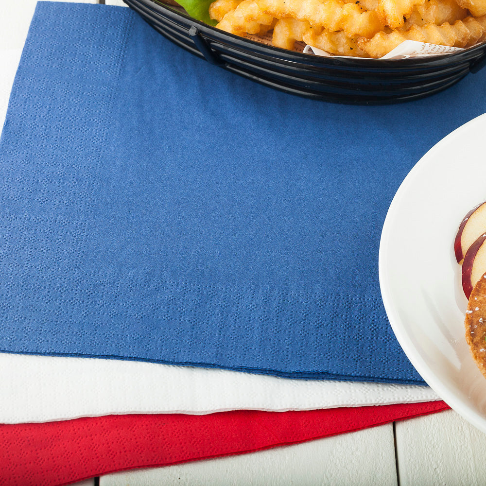 Make a stylish statement at your next event with our Luxenap Micropoint 2-Ply Disposable Napkins. Made from recyclable 2-ply paper, these unique paper napkins feature a gorgeous border of finely embossed micropoint detailing. Their richly hued blue paper construction adds a pop of color to place settings and tablescapes, while their conveniently disposable design ensures quick and easy post-event cleanup. Provide these decorative paper dinner napkins alongside yummy fare at your food truck -- or use them to stylishly set tables at an outdoor catered event. Measuring 15.5 inches in length by 15.25 inches in height when unfolded, these beautiful paper napkins comfortably cover customers' laps to keep clothing clean and protected. These navy blue napkins will arrive ready-to-use in pre-folded 7.75-inch by 7.5-inch squares. Browse our extensive collection of disposable tableware to effortlessly complete the look! Available in a 1,800 count box.
