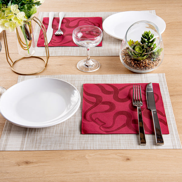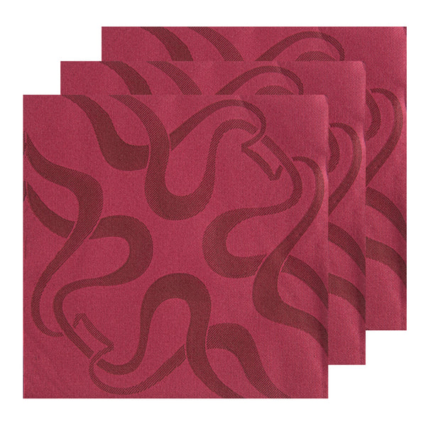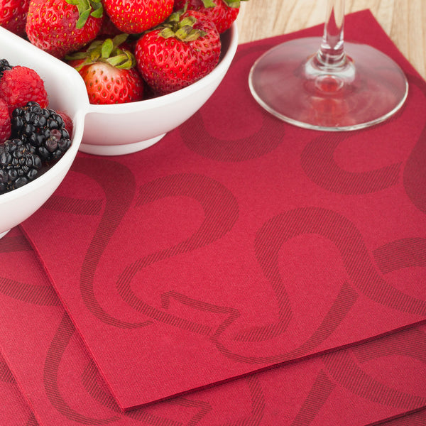 Use our conveniently disposable Luxenap Air Laid Napkins to easily reset the tables at a crowded cafe, or to instantly enhance the look of disposable flatware at your next catered event. Made from premium air laid paper, these cloth-like napkins are velvety soft and incredibly absorbent. Their textile-like surface has the luxurious look and drape of linen, while their non-linting and static-free construction guarantees that your customers' clothing remains pristine and protected. Covered in a billowing swirled pattern, these sophisticated red napkins can be used anywhere you would use linen napkins. Each of these richly colored paper napkins will arrive pre-folded in ready-to-use 8-inch by 8-inch squares -- so you won't have to waste time intricately folding linens or rolling silverware. Measuring 16 inches by 16 inches when unfolded, these thick paper napkins are large enough to comfortably cover your customers' laps and ensure that they'll only need one napkin to get through the meal. Browse our extensive collection of upscale disposable flatware to complete the look! Sold in a 25 count box.