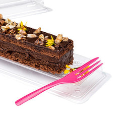 Smoothly cut through thickly layered cakes and lattice-topped fruit cobblers with our Coppetta Magenta Plastic Cake Forks with Knife Edge. These fruit forks are crafted from premium plastic and have sturdy handles that withstand big, hefty bites. Designed with a built-in knife edge, these cake forks will effortlessly glide through your delectable desserts to deliver the perfect bite every time. The extra-wide knife-edged tine of these plastic forks easily cuts through dense cakes. With a vivid magenta finish, these pastry forks add a pop of color to your food presentation. These dessert forks make cleaning easy, as they are disposable. Measuring 4 inches long by 0.75 inches wide, these disposable forks are perfect for mini appetizers at cafes, food trucks, or catered events. Sold in a 100 count box.