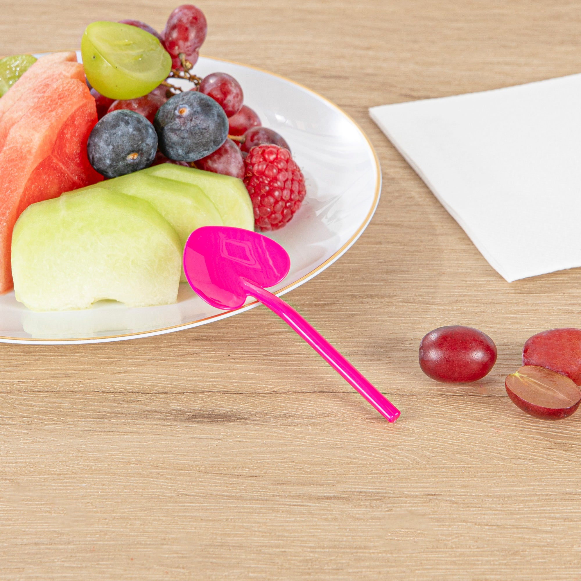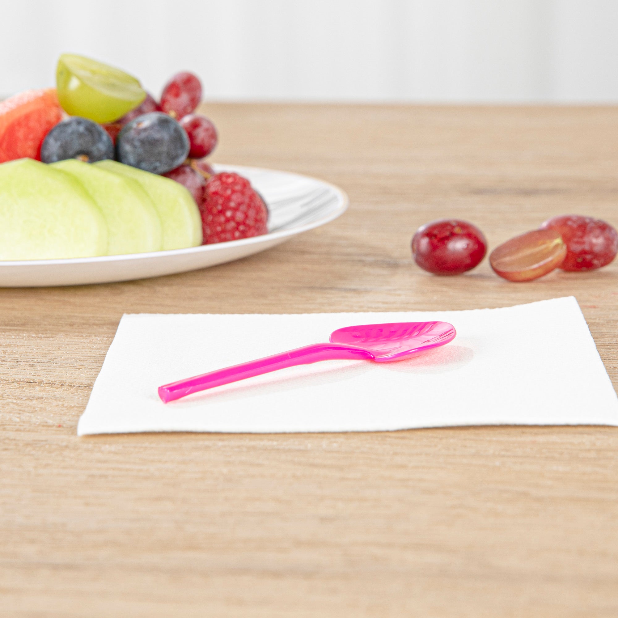 Serve your sweet treats with vibrant bursts of color with our Coppetta Magenta Plastic Love Shovel Spoons. Featuring a unique heart-shaped shovel design, these small plastic spoons are perfect for scooping up gobs of freshly churned frozen custard. These dessert spoons have a contemporary slender handle that is easy to grip and comfortable for customers to hold. With a sturdy plastic construction, these recyclable tasting spoons ensure they are strong enough to stand up to heavy spoonfuls of ice cream and frozen yogurt. These vibrant dessert spoons can be disposed of after use to make cleaning easy. Measuring 3.5 inches long by 1.25 inches wide, these small plastic spoons can also be used as sample spoons at tasting events and by catering companies. Sold in a 500 count box.