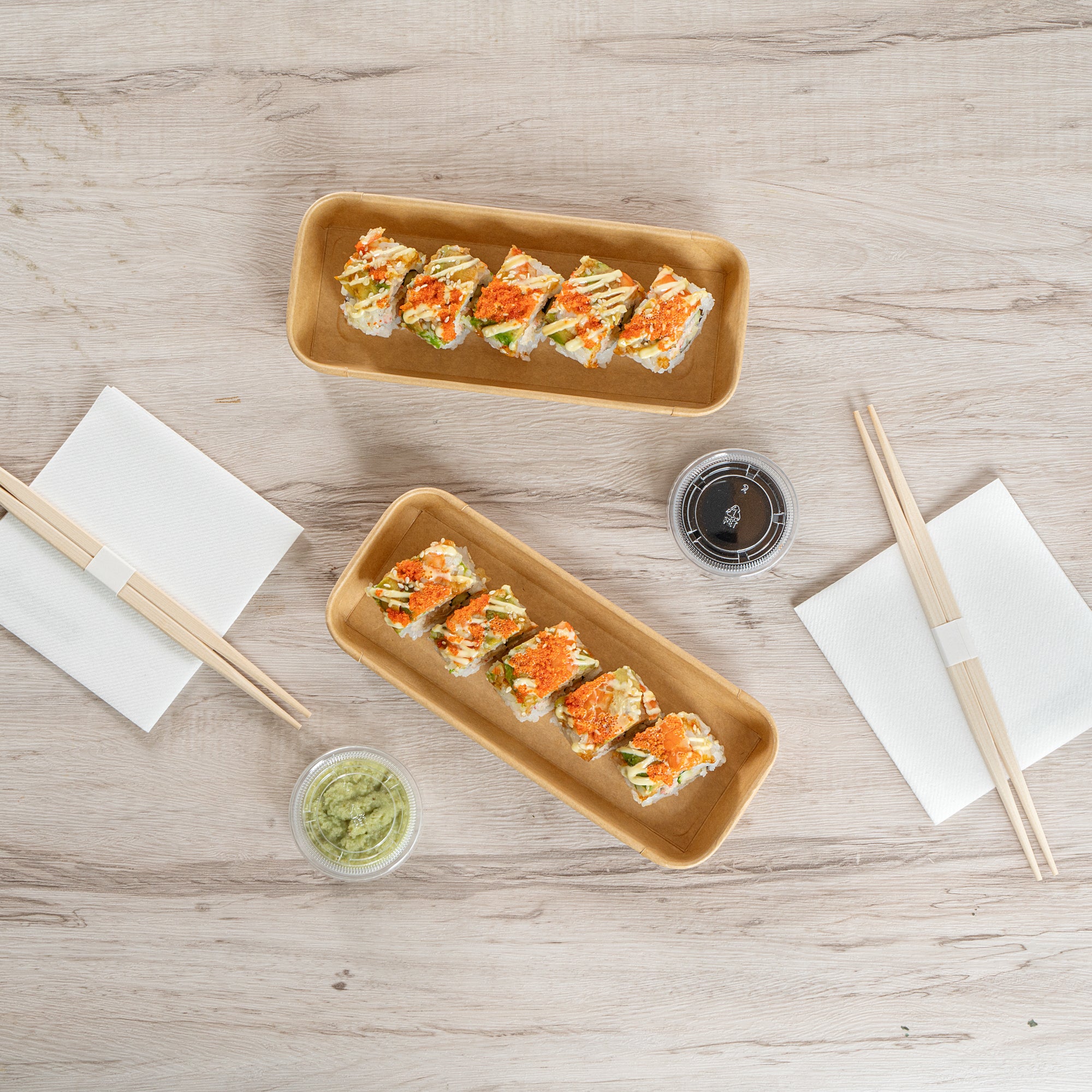 Elevate your food presentation with our Matsuri Vision 10-ounce Rectangle Kraft Paper Sushi Containers. Featuring a greaseproof PE coating, these sushi boxes ensure no sauces or oil seep through for a neat eating experience. These to go containers can be paired with their coordinating clear plastic lids (SKU: RWA1444C) to form a tight seal, making them perfect for on-the-go convenience. To store your leftovers in the refrigerator for later use, these take out boxes are designed to be freezer-safe. Created from durable paper, these takeaway boxes can hold a wide variety of cold food items, including sushi, salads, sandwiches, and desserts. With a sturdy base, these paper take out boxes are ideal for securely holding and transporting your exquisite sushi. These disposable food containers allow you to discard them after use and make post-meal cleanup a breeze. With a rustic kraft look, these carry out containers offer a charming aesthetic and are perfect for packaging various foods. These take out containers are recyclable and offer an eco-friendly alternative to traditional plastic containers. Measuring 8.75 inches in length by 3.5 inches in width by 1 inch in height, these to go boxes can hold up to 10 ounces and offer ample space for your culinary creations. Sold in a 100 count box. Lids are available and sold separately.