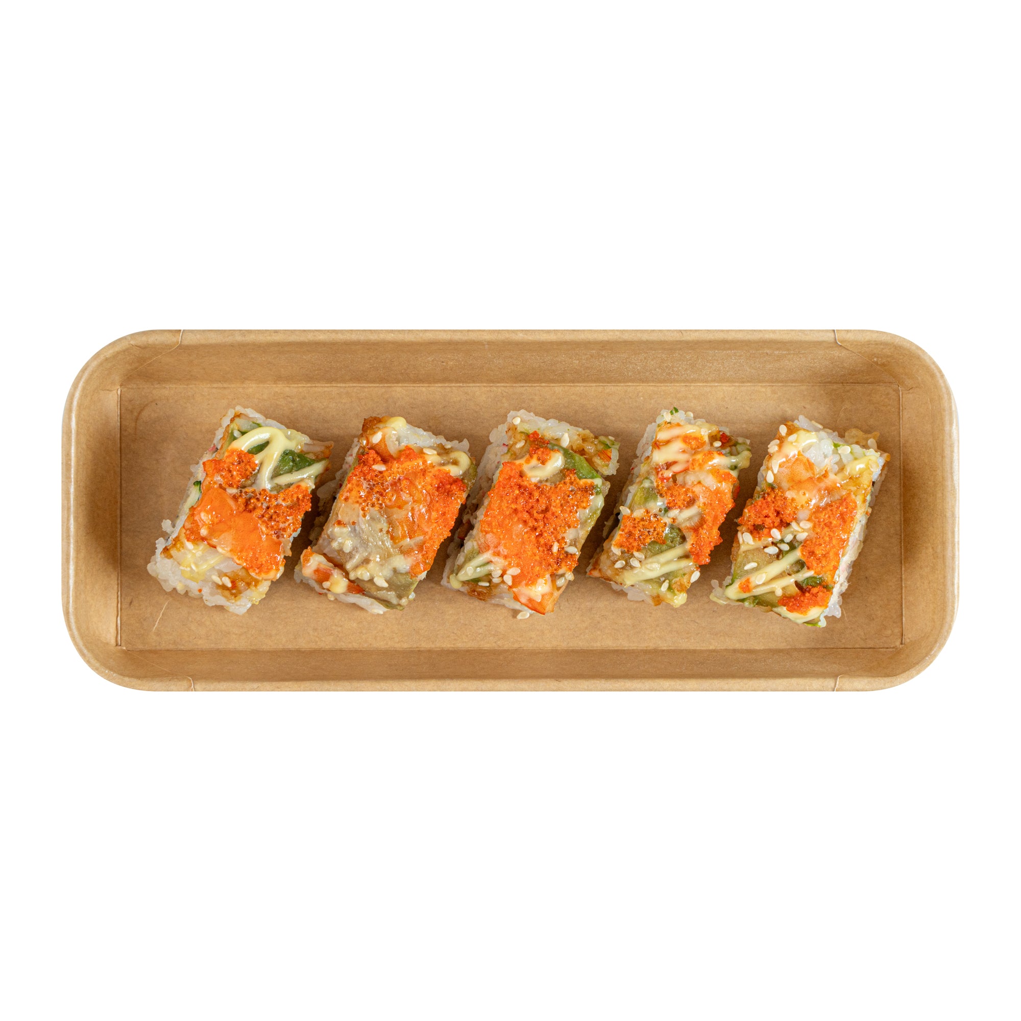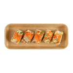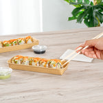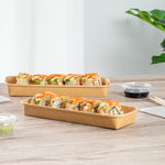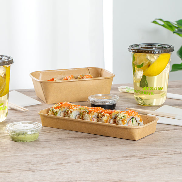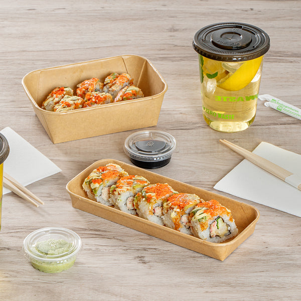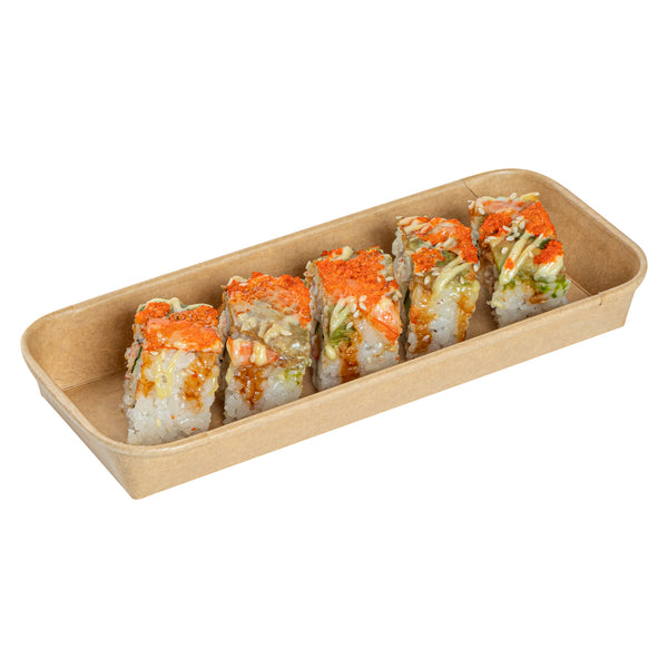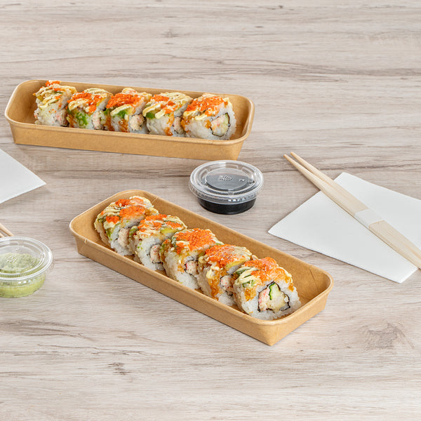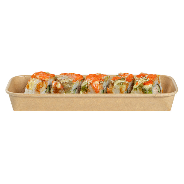 Elevate your food presentation with our Matsuri Vision 10-ounce Rectangle Kraft Paper Sushi Containers. Featuring a greaseproof PE coating, these sushi boxes ensure no sauces or oil seep through for a neat eating experience. These to go containers can be paired with their coordinating clear plastic lids (SKU: RWA1444C-50) to form a tight seal, making them perfect for on-the-go convenience. To store your leftovers in the refrigerator for later use, these take out boxes are designed to be freezer-safe. Created from durable paper, these takeaway boxes can hold a wide variety of cold food items, including sushi, salads, sandwiches, and desserts. With a sturdy base, these paper take out boxes are ideal for securely holding and transporting your exquisite sushi. These disposable food containers allow you to discard them after use and make post-meal cleanup a breeze. With a rustic kraft look, these carry out containers offer a charming aesthetic and are perfect for packaging various foods. These take out containers are recyclable and offer an eco-friendly alternative to traditional plastic containers. Measuring 8.75 inches in length by 3.5 inches in width by 1 inch in height, these to go boxes can hold up to 10 ounces and offer ample space for your culinary creations. Sold in a 50 count box. Lids are available and sold separately.