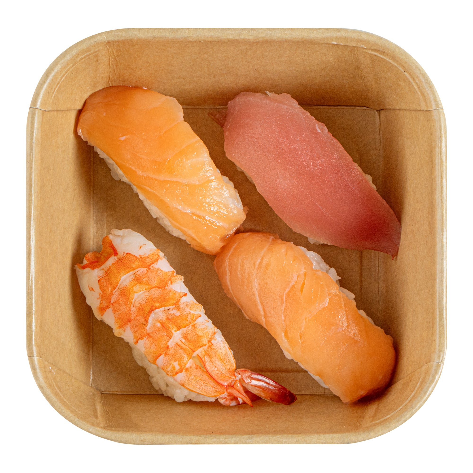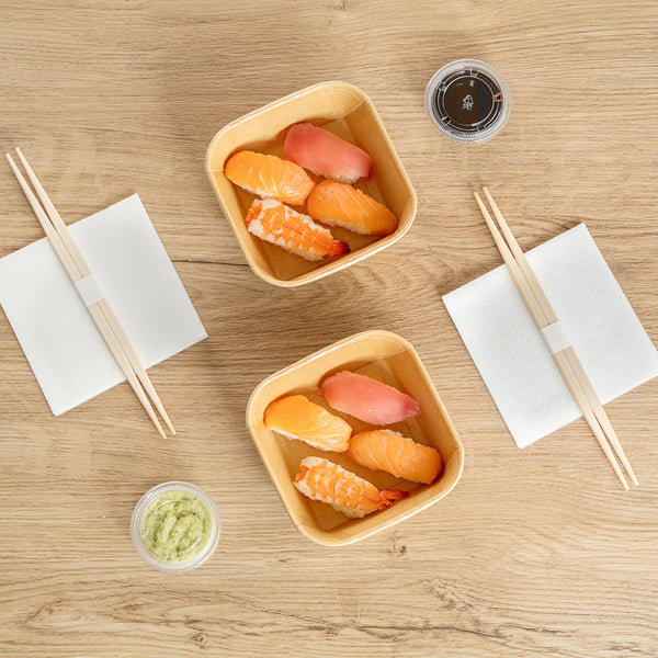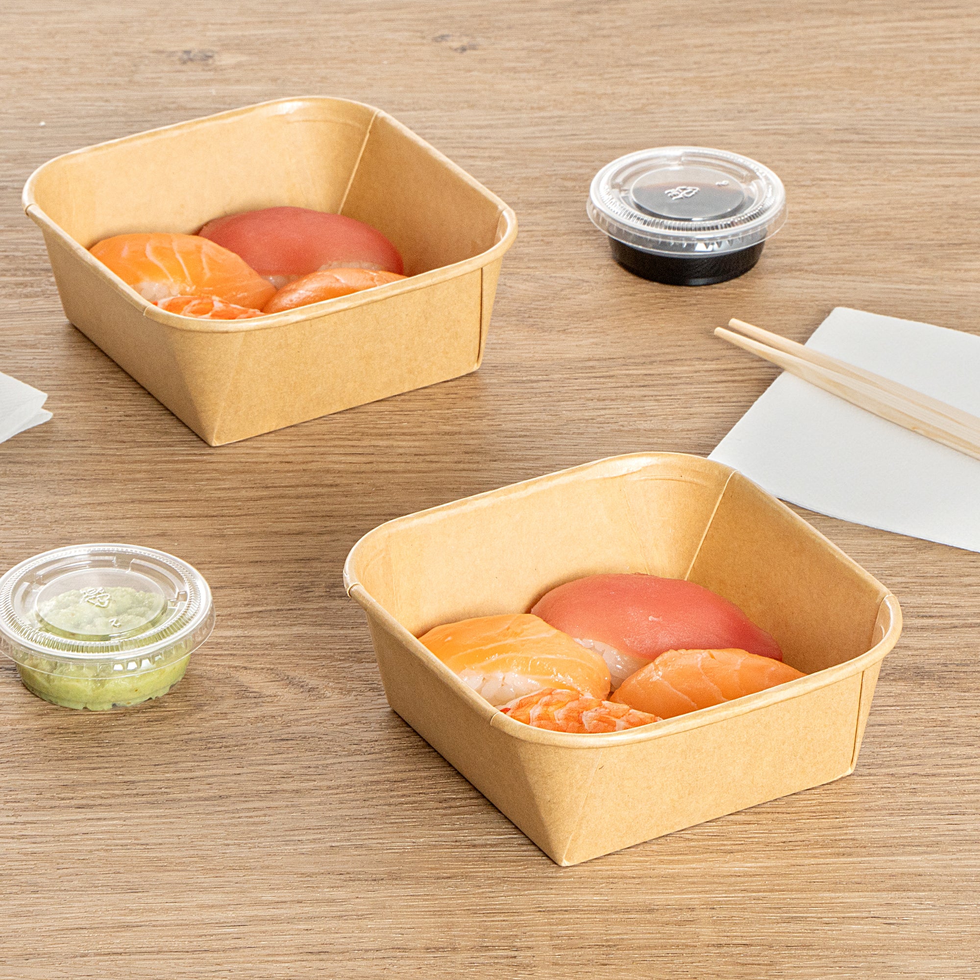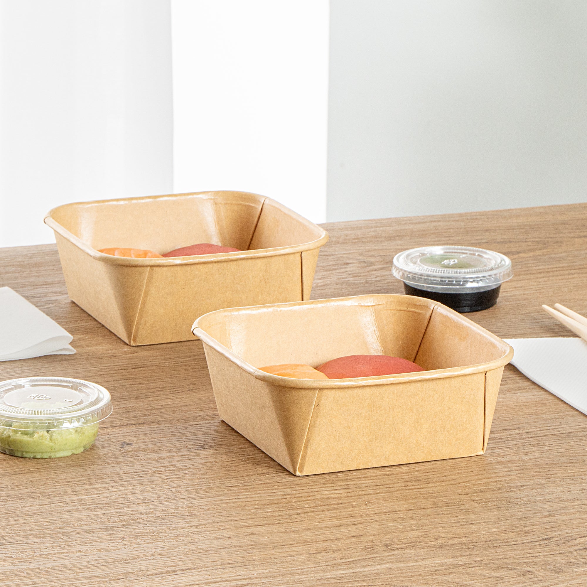 Serve maki sushi with our Matsuri Vision 17-ounce Square Kraft Paper Sushi Containers. These sushi boxes feature a PE coating that prevents sauces and oil from leaking, ensuring your dishes remain intact and presentable. To make these takeaway boxes portable, pair them with their coordinating clear plastic lids (SKU: RWA1463C-50) for a tight seal and securely transport your meals. These to go containers are freezer-safe, allowing you to store leftovers conveniently in the refrigerator for later use. Made from premium paper, these carry out containers are durable and suitable for serving various cold food items. These to go boxes have a sturdy base that provides stability and support, ensuring secure storage and transport of your food items. To simplify your cleanup, these take out boxes are disposable and can be discarded after use. These disposable food containers are recyclable and offer an eco-friendly alternative to traditional plastic containers. With a rustic kraft finish, these paper take out boxes exude a stylish and natural aesthetic, perfect for various packaging needs. These takeaway containers measure 5 inches in length by 5 inches in width by 2 inches in height and have a capacity of 17 ounces, making them perfect for your culinary needs. Sold in a 50 count box. Lids are available and sold separately.