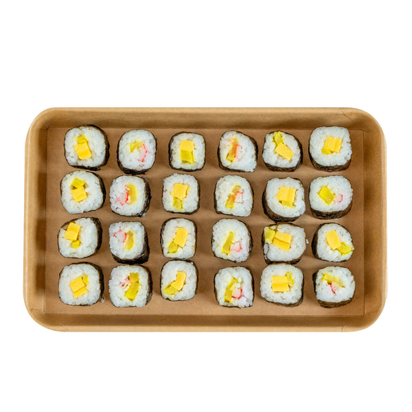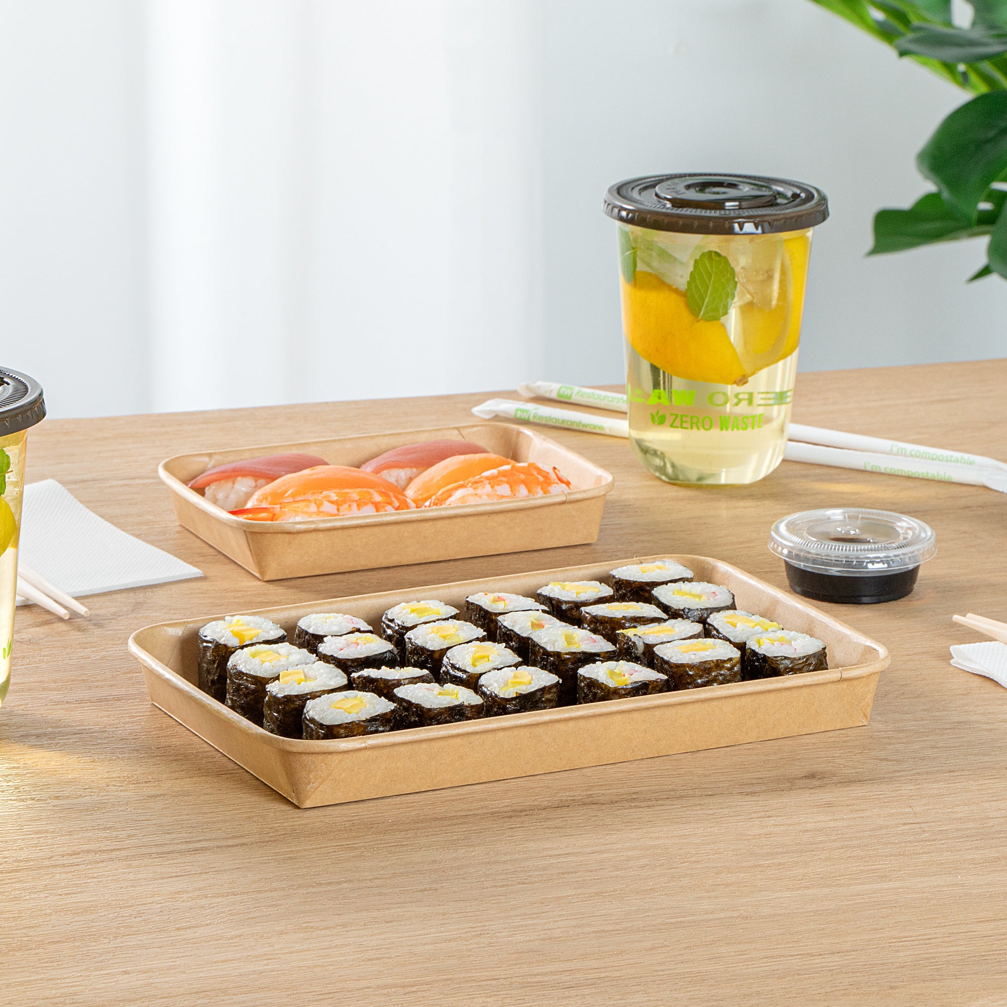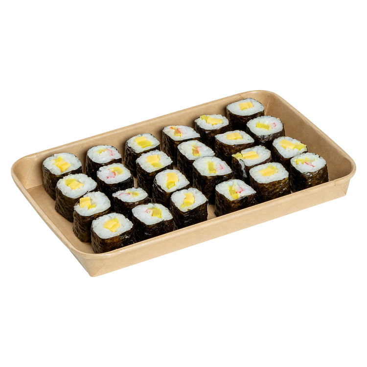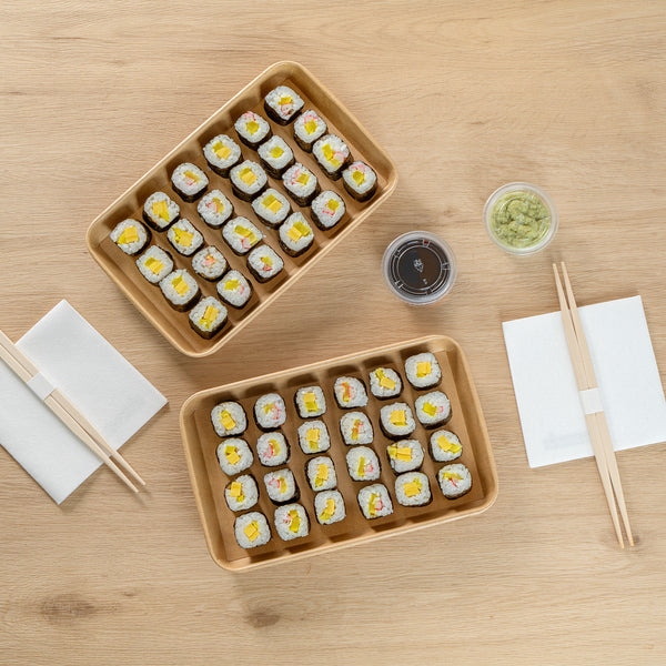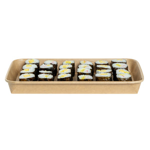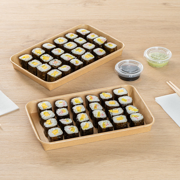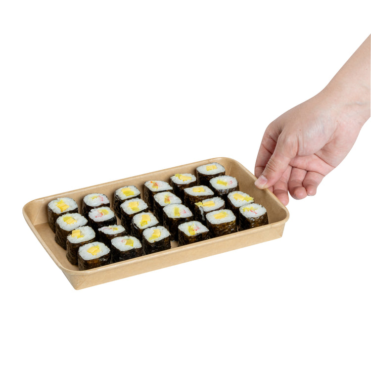 Effortlessly serve your delicious sushi creations with our Matsuri Vision 20-ounce Rectangle Kraft Paper Sushi Containers. These sushi boxes have a greaseproof PE coating that prevents sauces and oil from leaking, ensuring a mess-free dining experience. For an ideal take out solution, these to go containers can be paired with their coordinating clear plastic lids (SKU: RWA1452C-50) to form a secure seal and ensure your meals stay intact in transit. These take out boxes are freezer-safe and allow you to store leftovers in the refrigerator. Crafted from premium paper, these takeaway boxes are durable and suitable for serving a wide variety of cold food items. These carry out containers are equipped with a sturdy base for reliable support and securely hold your exquisite sushi roll. For a straightforward cleaning experience, these disposable food containers can be discarded after use. These paper take out boxes are recyclable and offer an eco-friendly alternative to traditional plastic containers. The rustic kraft look of these to go boxes creates a natural presentation, perfect for showcasing your culinary creations. These takeaway containers measure 9.5 inches in length by 6 inches in width by 1 inch in height and have a capacity of 20 ounces, making them perfect for substantial portions. Sold in a 50 count box. Lids are available and sold separately.