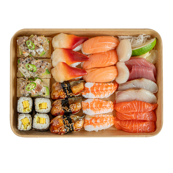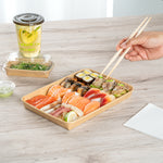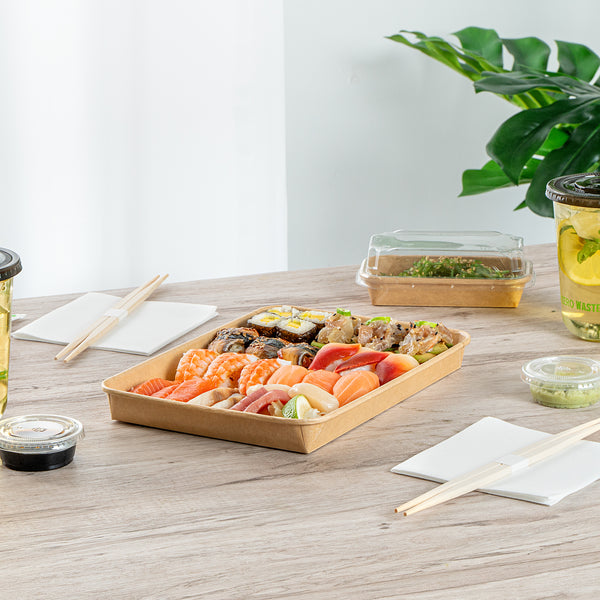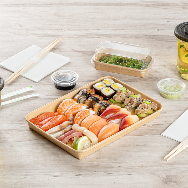 Elevate your foodservice experience with our Matsuri Vision 23-ounce Rectangle Kraft Paper Sushi Containers. For a mess-free dining experience, these sushi boxes feature a greaseproof PE coating and prevent sauces and oil from leaking through. These to go containers can be paired with their coordinating clear plastic lids (SKU: RWA1454C) to form a tight seal and eliminate spills in transit. Designed to be freezer-safe, these take out boxes are perfect for storing leftovers in the refrigerator for later use. These takeaway boxes are created from premium paper and are durable, making them suitable for serving various cold food items. With a sturdy base, these carry out containers provide reliable support for securely transporting and storing your food items. These takeaway containers are disposable and can be discarded for an easy post-meal cleanup. Made with sustainability in mind, these disposable food containers are recyclable and offer an eco-friendly alternative to traditional plastic containers. The rustic kraft look of these to go boxes adds a charming and natural aesthetic, perfect for food packaging solutions. With a generous capacity of 23 ounces, these paper take out boxes measure 10 inches in length by 7.25 inches in width by 1 inch in height. Sold in a 100 count box. Lids are available and sold separately.