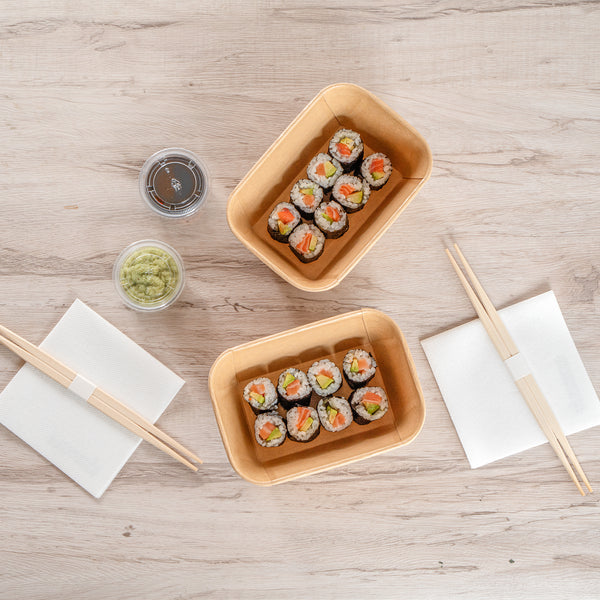 Pack delicious sushi with our Matsuri Vision 34-ounce Rectangle Kraft Paper Sushi Containers. These sushi boxes have a greaseproof PE coating to prevent oil and sauces from seeping through, providing a mess-free dining or takeaway experience. Pair these to go containers with their coordinating clear plastic lids (SKU: RWA1459C) and form a tight seal to keep your food intact during transportation. These take out boxes are freezer-safe, allowing you to safely store your food in the freezer for later consumption. Created from premium paper, these takeaway boxes are durable and suitable for packing various cold food items. These carry out containers have a sturdy base that enhances stability and ensures reliable support for food items during transportation or storage. To provide a straightforward cleaning experience, these disposable food containers can be discarded after use. These paper take out containers are recyclable and help minimize your carbon footprint, offering an eco-friendly alternative to traditional plastic containers. With a rustic kraft finish, these to go boxes exude a charming and natural appeal, perfect for enhancing the presentation of your food. With a generous capacity of 34 ounces, these takeaway containers measure 6.5 inches in length by 4.75 inches in width by 2.75 inches in height. Sold in a 100 count box. Lids are available and sold separately.