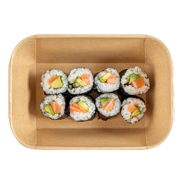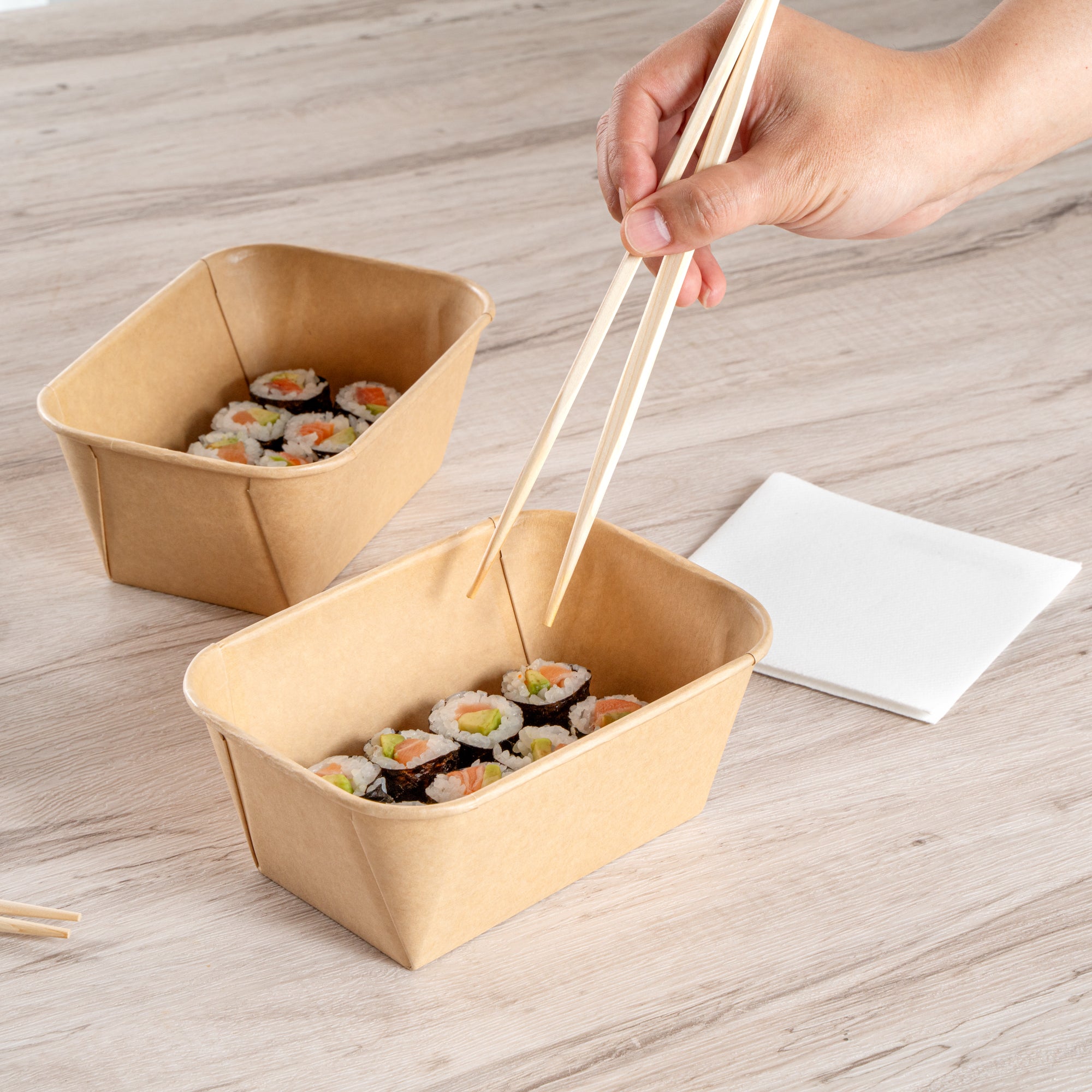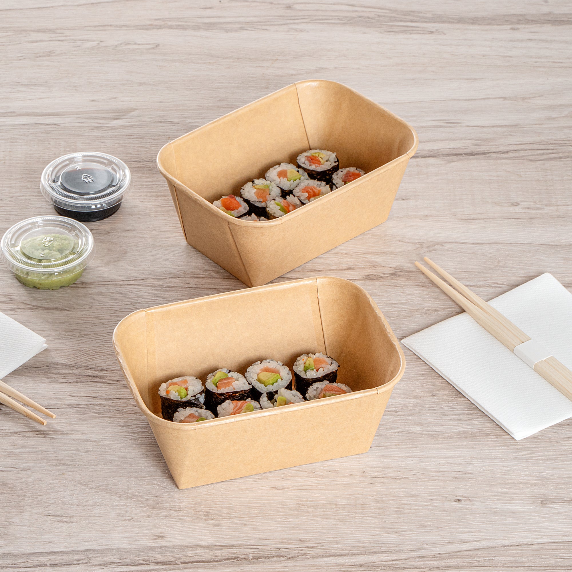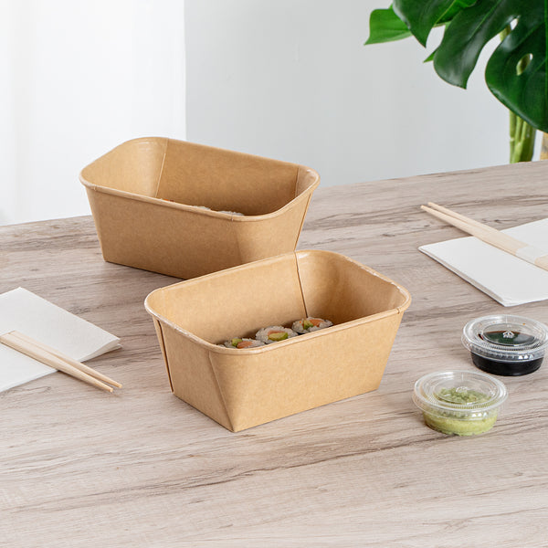 Pack delicious sushi with our Matsuri Vision 34-ounce Rectangle Kraft Paper Sushi Containers. These sushi boxes have a greaseproof PE coating to prevent oil and sauces from seeping through, providing a mess-free dining or takeaway experience. Pair these to go containers with their coordinating clear plastic lids (SKU: RWA1459C-50) and form a tight seal to keep your food intact during transportation. These take out boxes are freezer-safe, allowing you to safely store your food in the freezer for later consumption. Created from premium paper, these takeaway boxes are durable and suitable for packing various cold food items. These carry out containers have a sturdy base that enhances stability and ensures reliable support for food items during transportation or storage. To provide a straightforward cleaning experience, these disposable food containers can be discarded after use. These paper take out containers are recyclable and help minimize your carbon footprint, offering an eco-friendly alternative to traditional plastic containers. With a rustic kraft finish, these to go boxes exude a charming and natural appeal, perfect for enhancing the presentation of your food. With a generous capacity of 34 ounces, these takeaway containers measure 6.5 inches in length by 4.75 inches in width by 2.75 inches in height. Sold in a 50 count box. Lids are available and sold separately.