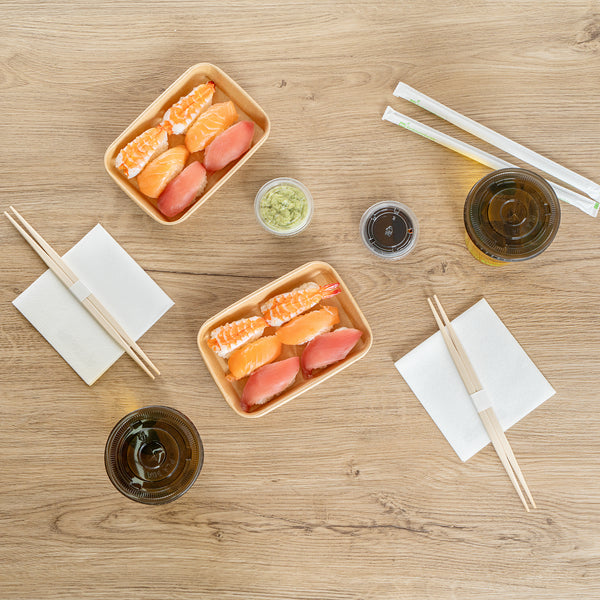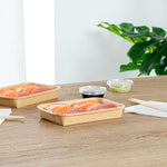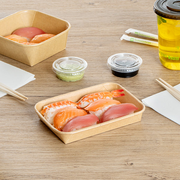 Elevate your food presentation and delivery with our Matsuri Vision 8-ounce Rectangle Kraft Paper Sushi Containers. With a greaseproof PE coating, these sushi boxes prevent sauces and oil from leaking through, ensuring a mess-free eating experience. These to go containers can be paired with their matching clear plastic lids (SKU: RWA1446C-50) and form a tight seal, keeping your food intact during transit. Ideal for storing food, these take out boxes are freezer-safe and let you refrigerate your leftovers. Crafted from durable paper, these takeaway boxes are perfect for serving various cold or chilled food items. These carry out containers are designed with a sturdy base and securely hold your food items in transportation. For a straightforward cleaning experience, these disposable food containers allow you to discard them after use. These paper takeaway containers are recyclable and offer an environmentally-friendly alternative to traditional plastic containers. The rustic kraft look of these to go boxes adds a charming and natural appeal, perfect for enhancing the presentation of your meals. These sushi containers measure 6.5 inches in length by 4.5 inches in width by 1 inch in height and can hold up to 8 ounces, making them ideal for single-serve portions. Sold in a 50 count box. Lids are available and sold separately.