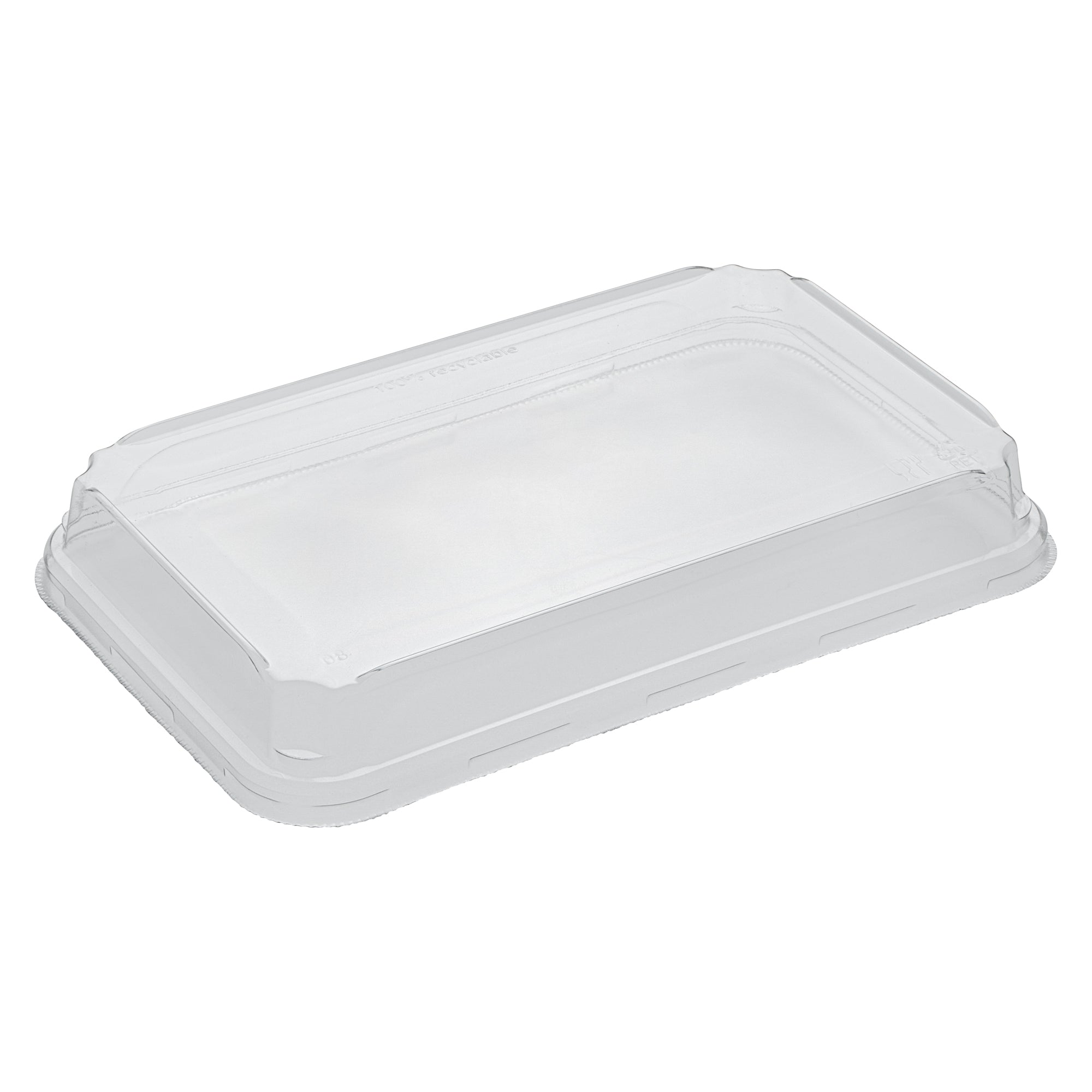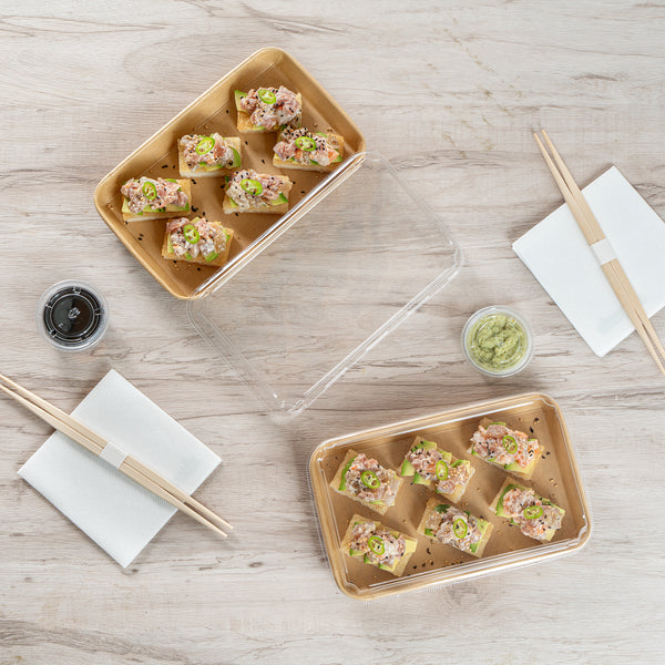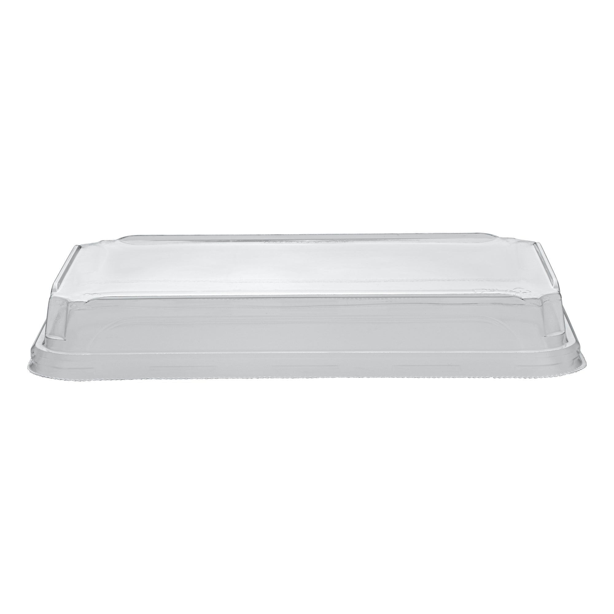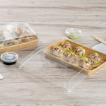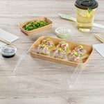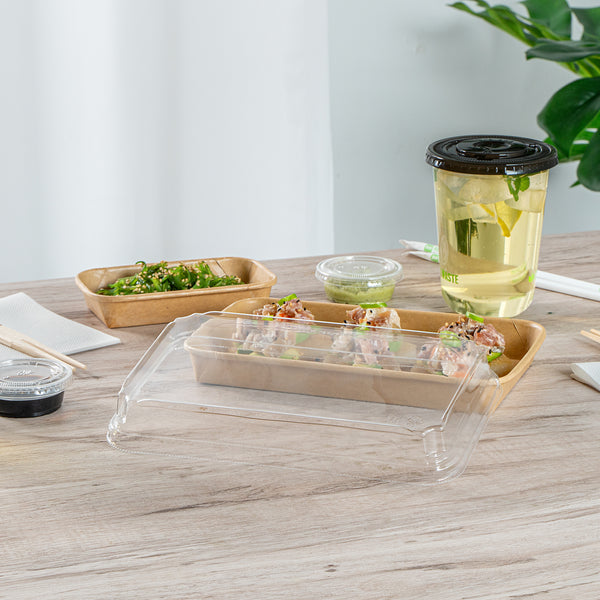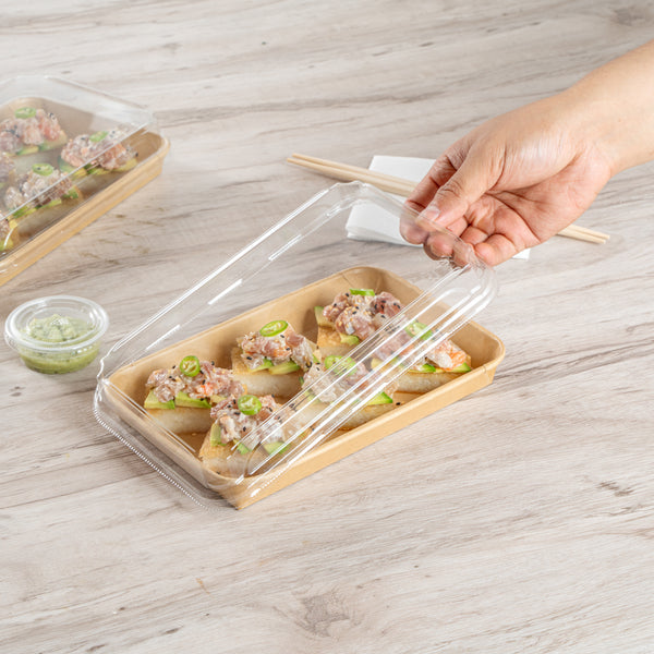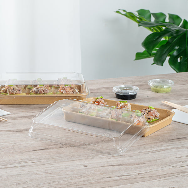 Enhance your food presentation with our Matsuri Vision Clear PET Plastic Lids. Pair these plastic lids with compatible containers (SKU: RWA1449K-50) to form a tight seal and prevent accidental openings or spills while on the go. With an innovative anti-fog design, these lids for food containers avoid build up condensation, ensuring customers can easily see the contents inside without obstruction. The dome-inspired shape of these clear plastic lids provides generous room and protects your sushi arrangements without squishing them. These dome lids have a transparent finish and showcase your food's vibrant colors and textures. Crafted from PET plastic, these container lids are durable and sturdy for optimal performance. These to go container lids are disposable and can be discarded after use for an easy cleanup. Ideal for eco-conscious foodservice establishments, these disposable lids are recyclable to reduce your carbon footprint. Each clear lid measures 8.75 inches in length by 5.5 inches in width by 1.25 inches in height. Sold in a 50 count box. Containers are available and sold separately.