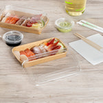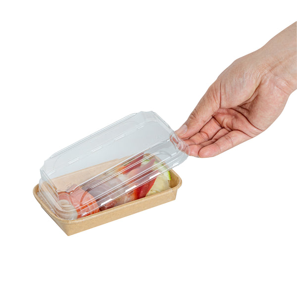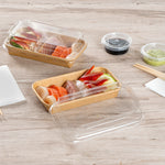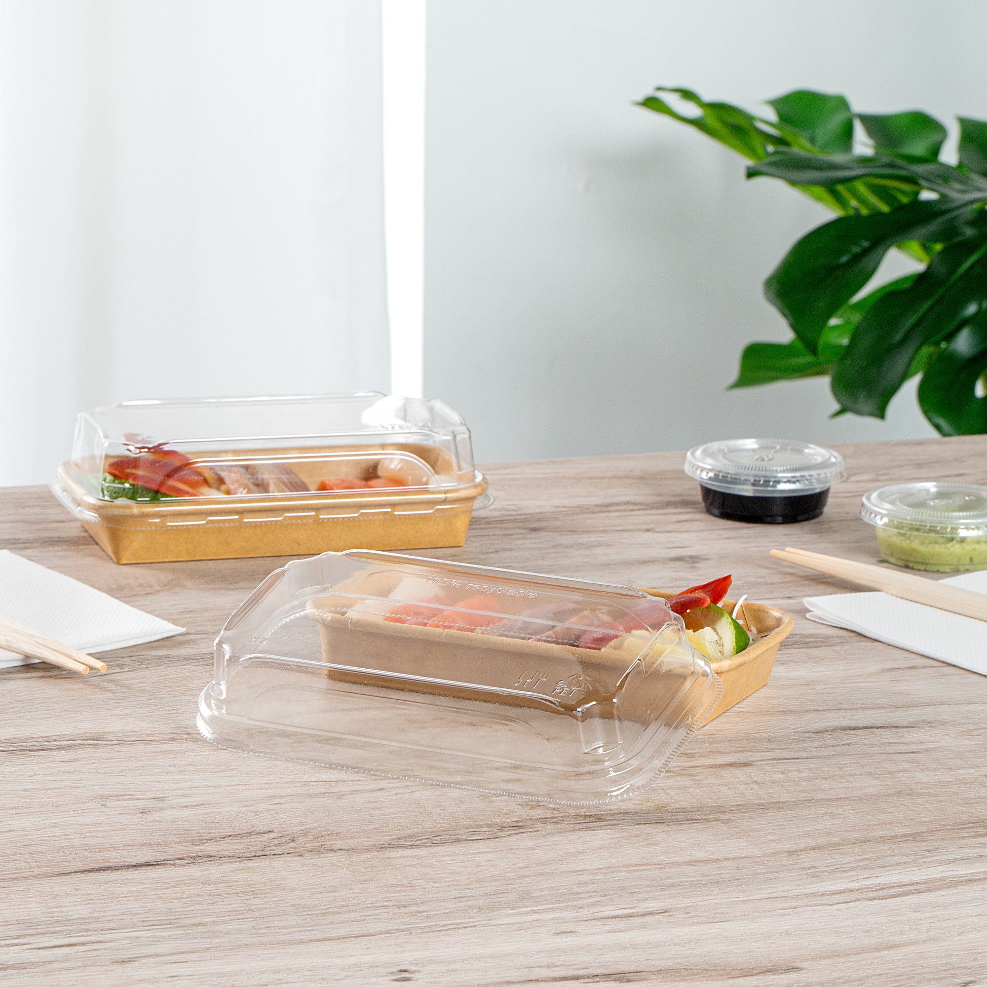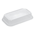 Enhance your food presentation with our Matsuri Vision Clear PET Plastic Lids. Pair these dome lids with their compatible containers (SKU: RWA1441K) to form a tight-fitting seal and prevent accidental openings or spills in transit. These lids for food containers have an anti-fog design and prevent condensation buildup, ensuring customers can easily see the contents inside without any obstruction. The innovative dome-inspired shape of these clear plastic lids provides generous room, ensuring the intricate toppings and delicate arrangements of sushi are protected without being squished. Featuring a crystal-clear finish, these container lids showcase the vibrant colors and textures of the sushi. Crafted from PET plastic, these disposable lids are durable and sturdy for optimal performance. To simplify your cleaning process, these clear lids are disposable and can be discarded after use. These to go sushi container lids are recyclable and help reduce your environmental footprint. Measuring 6.5 inches in length by 3.75 inches in width by 1.25 inches in height, these plastic lids ensure a snug fit on your sushi containers. Sold in a 50 count box. Containers are available and sold separately.