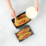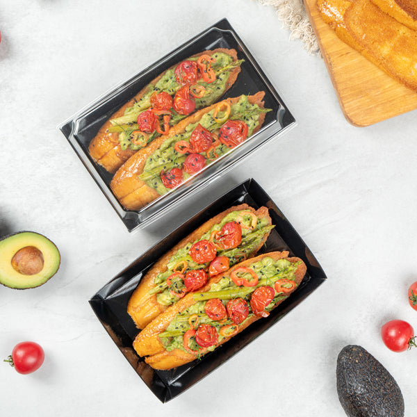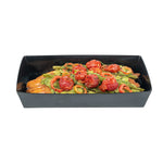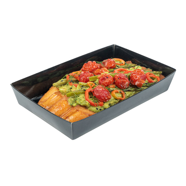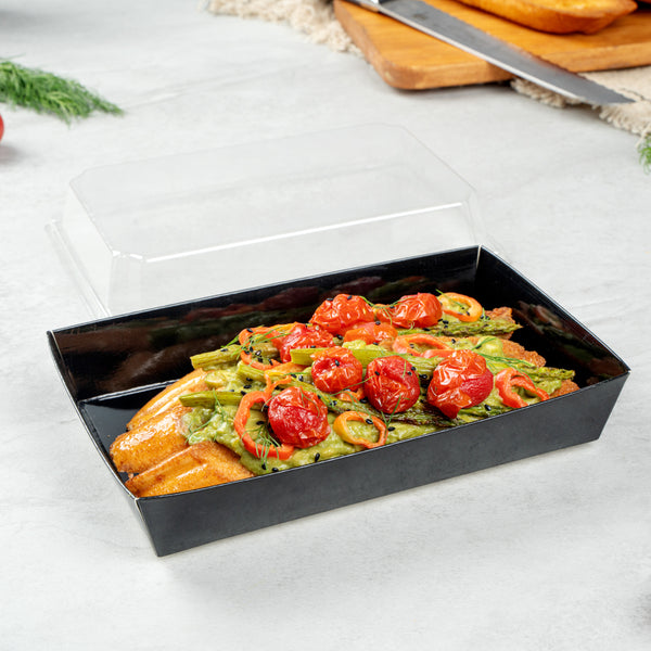 Pack up grab-and-go dishes with our Matsuri Vision Rectangle Black Paper Medium Sushi Trays. These sushi containers are equipped with a greaseproof PE lining to provide a mess-free dining experience. Coordinate these to go sushi trays with our compatible Matsuri Vision lids to maintain the freshness of customers' meals during carry out or delivery services (SKU: RWA1047C). Featuring a black finish, these medium sushi containers provide a sleek and neutral surface to present specialty sushi rolls. Crafted from high-quality paper, these to go sushi boxes are recyclable for a shortened cleaning process. To save space in your establishment's kitchen or storage area, these black sushi trays are stackable. With a measurement of 8 inches in length by 5 inches in width by 1.5 inches in height, these rectangular sushi trays are great for displaying numerous sushi rolls. Sold in a 100 count box. Compatible Matsuri Vision lids are available and sold separately.