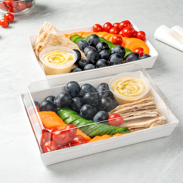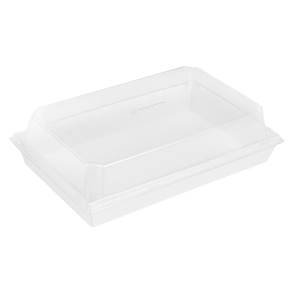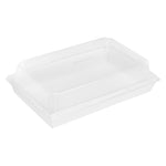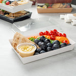 Easily package various sushi rolls with our Matsuri Vision Rectangle White Paper Large Sushi Trays. Equipped with a PE lining, these to go sushi containers are greaseproof to prevent sauces or oils from leaking through. Coordinate these take out sushi trays with our compatible Matsuri Vision lids to keep meals secure during transport (SKU: RWA1049C). With a classic, white finish, these large sushi trays provide a simple, clean aesthetic to your take out supplies. Built from high-quality paper, these white sushi trays are recyclable for quick and easy clean up. For space-saving storage, these to go containers are stackable. These sushi trays have a total measurement of 9 inches in length by 6 inches in width by 1.5 inches in height. Sold in a 100 count box. Compatible Matsuri Vision lids are available and sold separately.