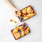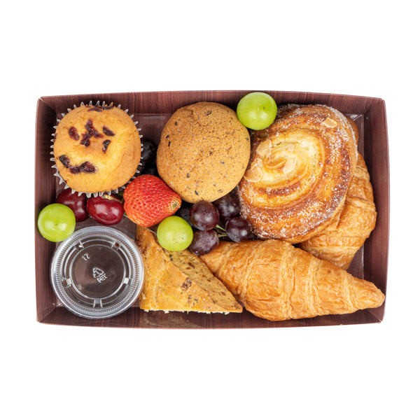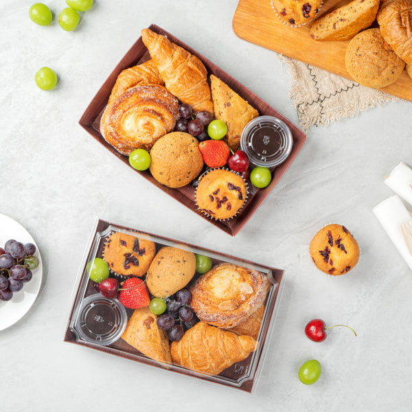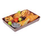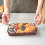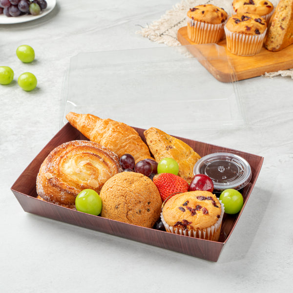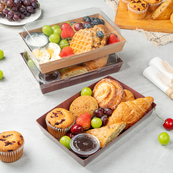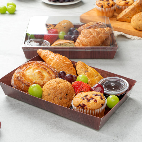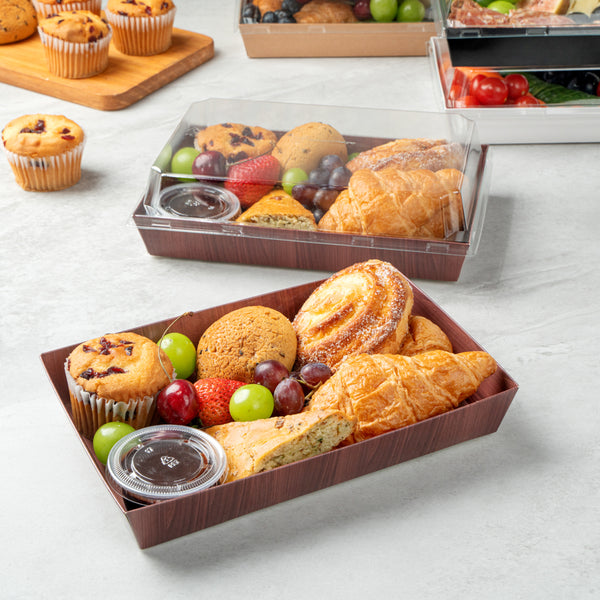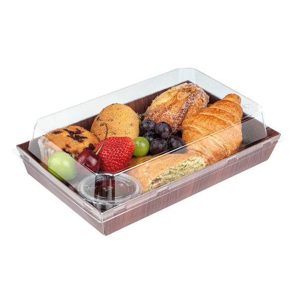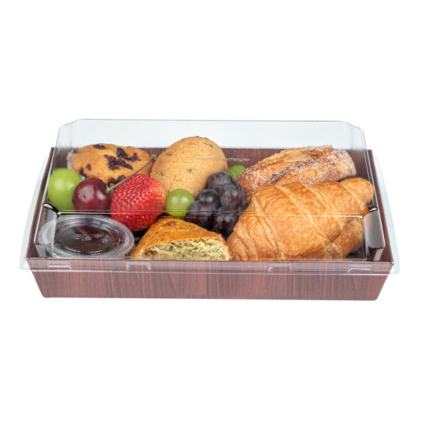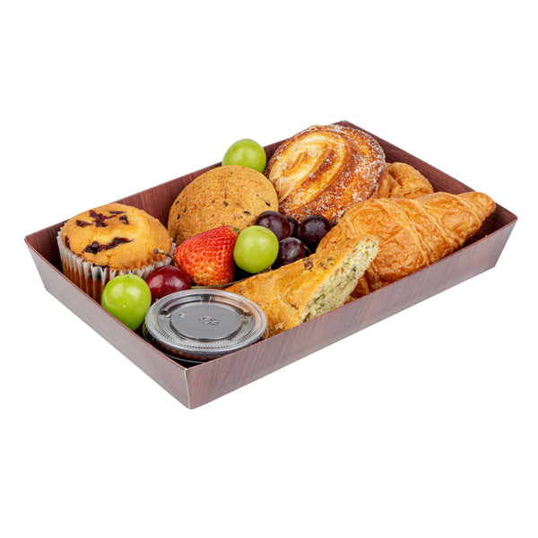 Serve customers' sushi platters in style using our Matsuri Vision Rectangle Wood Grain Paper Large Sushi Trays. Crafted with a PE lining, these paper sushi trays are greaseproof to keep oils from seeping through. Pair these take out sushi containers with our compatible Matsuri Vision lids to securely seal in meals for transport (SKU: RWA1049C). Featuring a wood grain finish, these to go sushi boxes provide a one-of-a-kind look to packaged orders. Constructed from premium paper, these durable sushi containers are conveniently recyclable to shorten your cleanup process. These to go containers are stackable for space-saving storage in your establishment. With a total measurement of 9 inches in length by 6 inches in width by 1.5 inches in height, these to go sushi trays are perfect for all of your seafood specialties. Sold in a 100 count box. Compatible Matsuri Vision lids are available and sold separately.