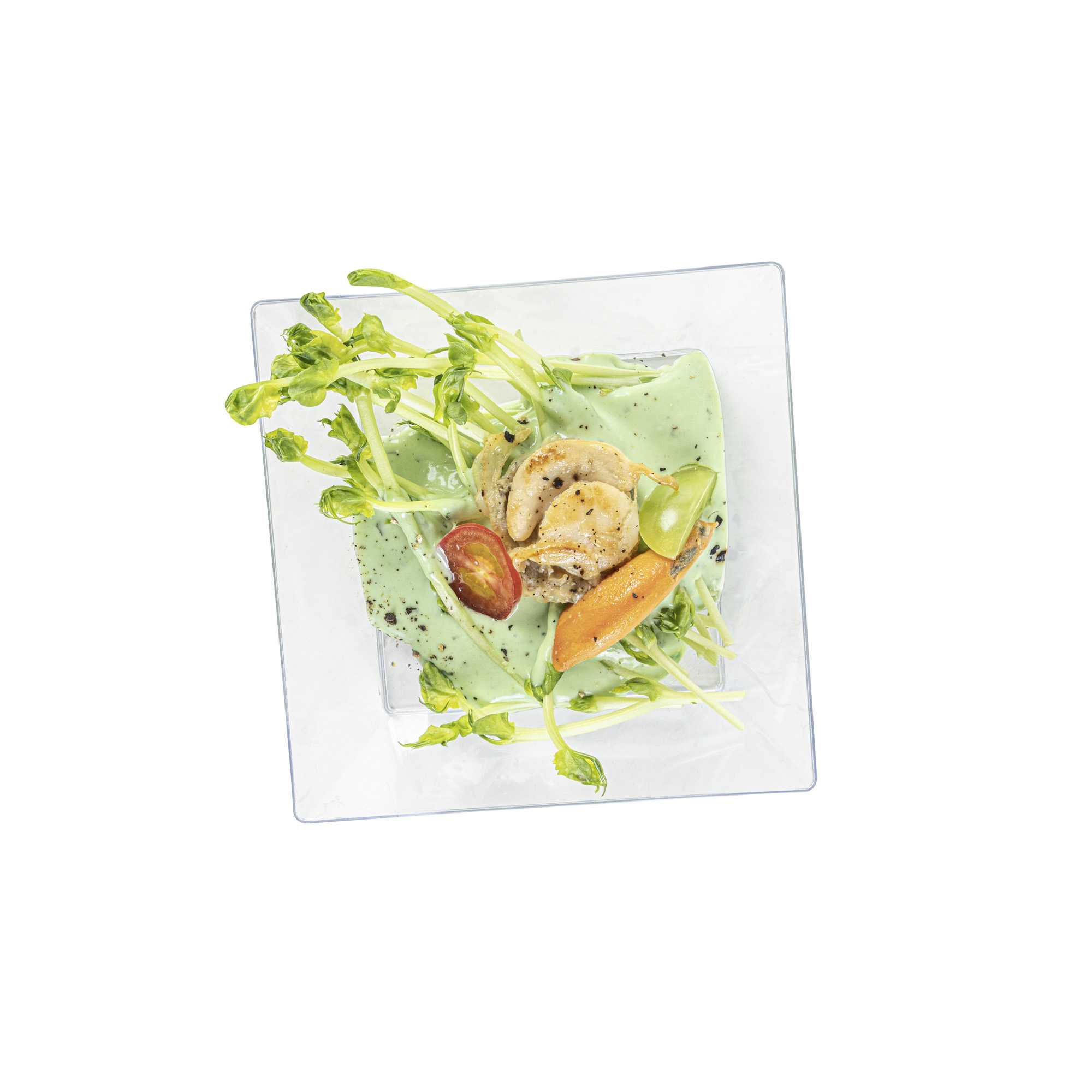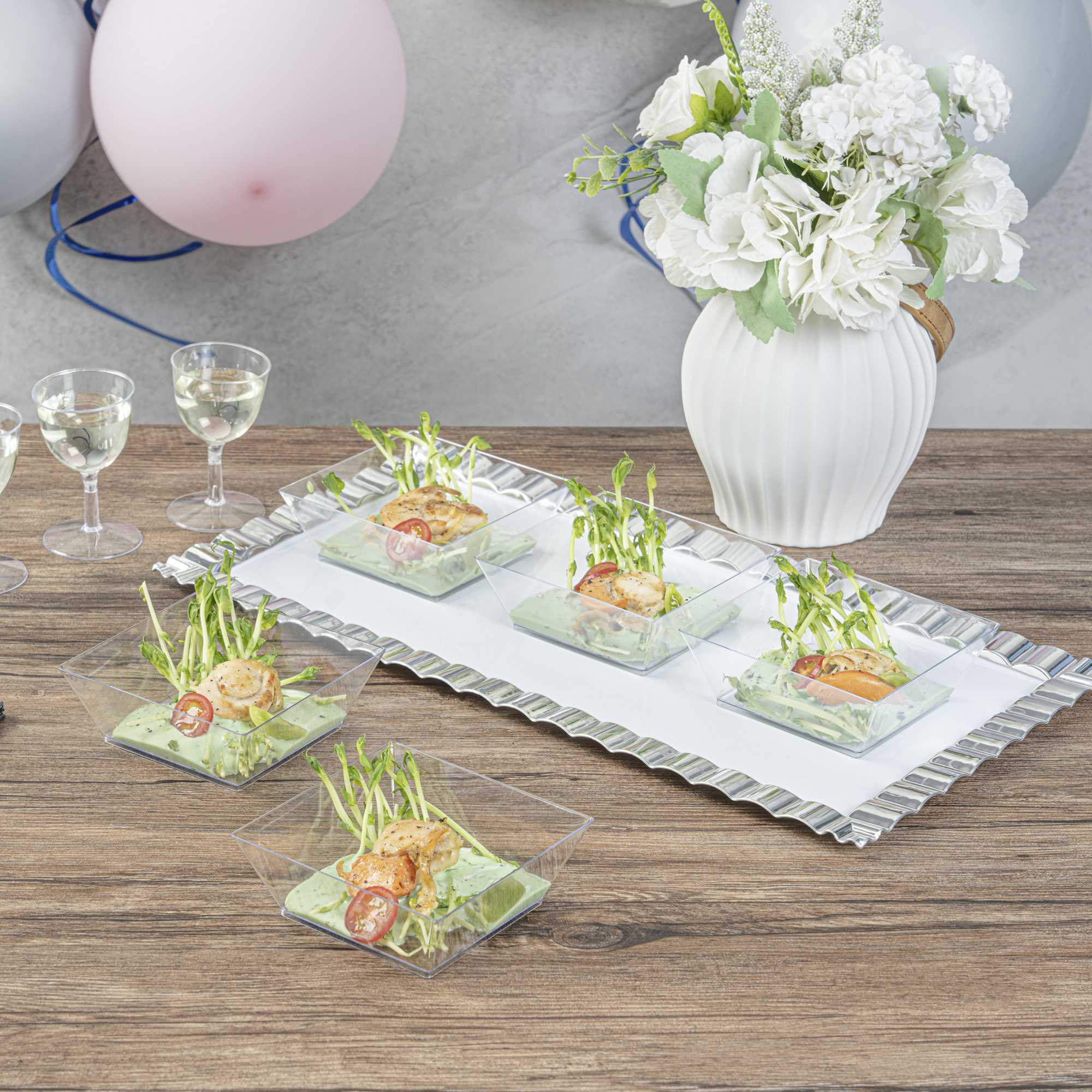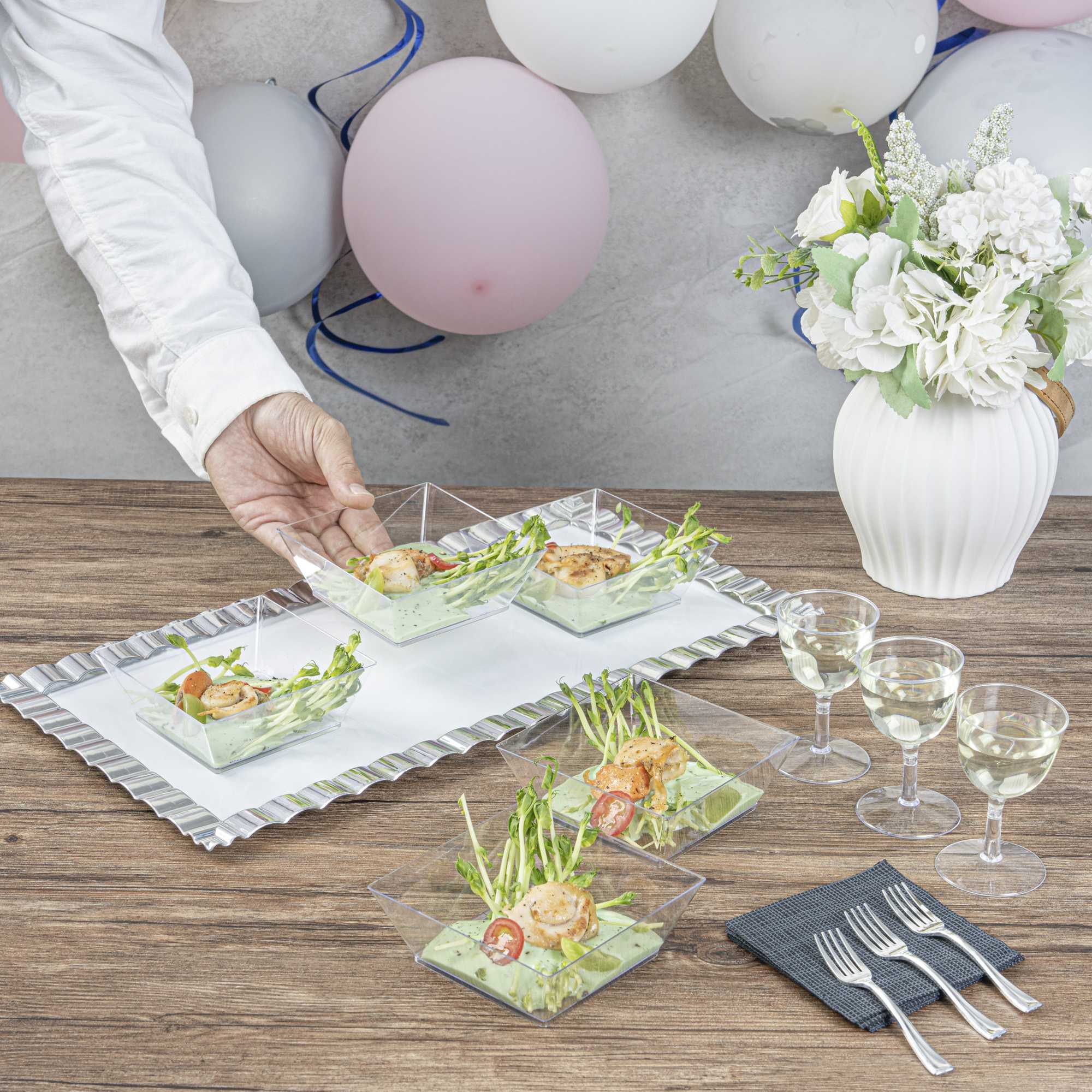 Unveil your salads and other delights in our Maxi Serve 10-ounce Square Clear Plastic Small Modern Bowls. Fabricated using top-tier plastic, these clear bowls promise enduring durability and are ideally suited for various wet, dry, or chilled delicacies at your themed catering occasion.These plastic bowls have a contemporary square silhouette and act as an appealing canvas that highlights the allure of your servings. With a capacity of 10 ounces, these square bowls are ideally sized for single-serving meals. These salad bowls have a transparent finish that elevates the visual appeal, breathing life into your culinary presentations. Constructed with a lightweight material, these disposable bowls ensure comfortable handling and convenience. These food containers are conveniently disposable to smoothen your post-event chores. Measuring 4.25 inches in length by 4.25 inches in width by 1.5 inches in height, these serving bowls can accommodate up to 10 ounces. Sold in a 25 count box.
