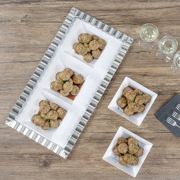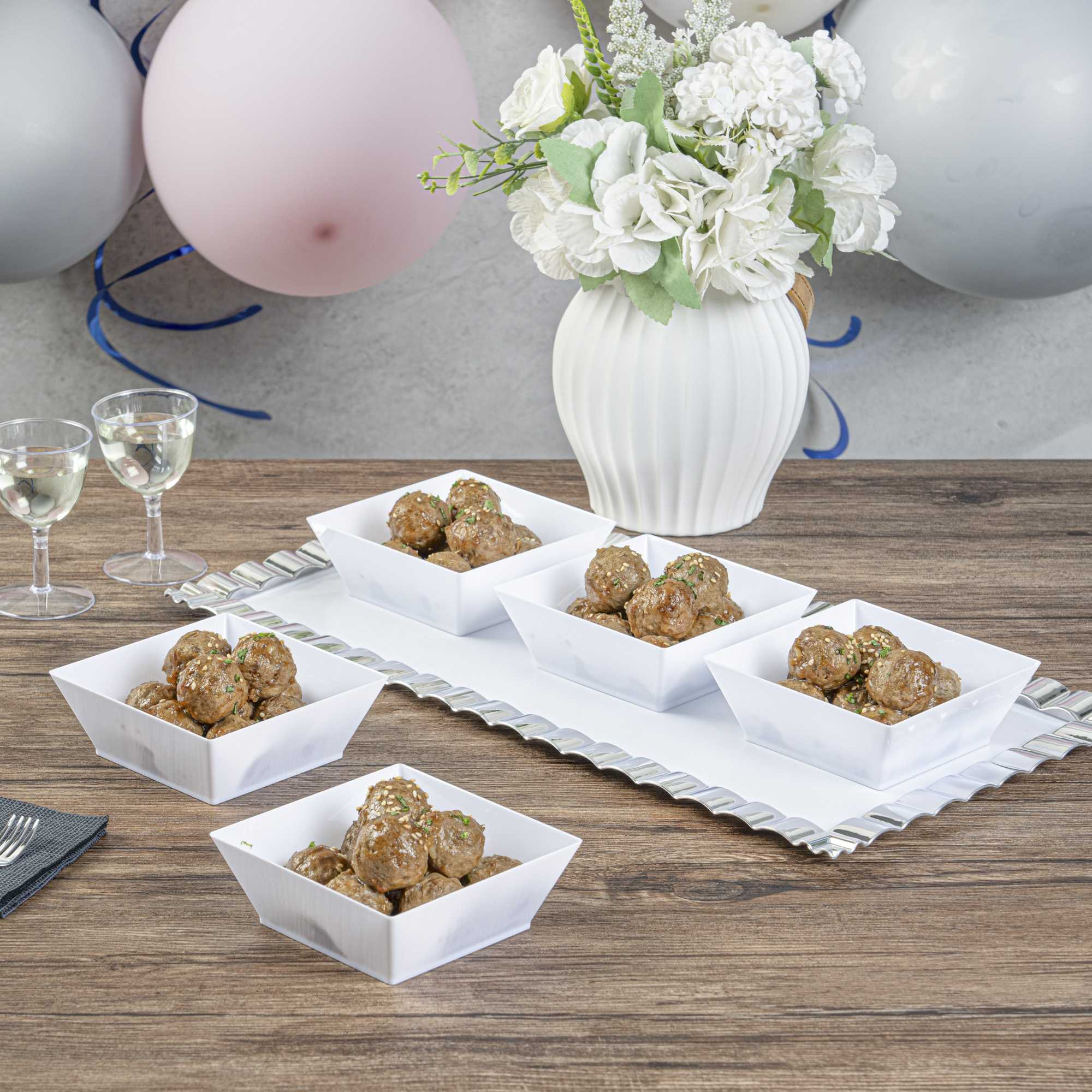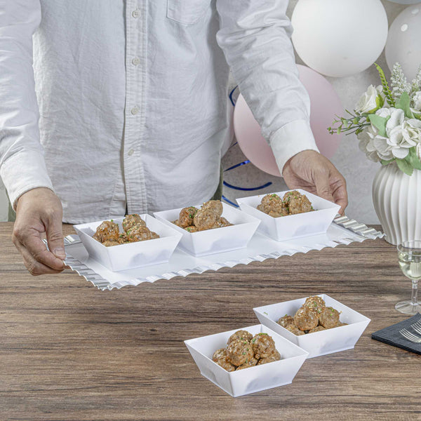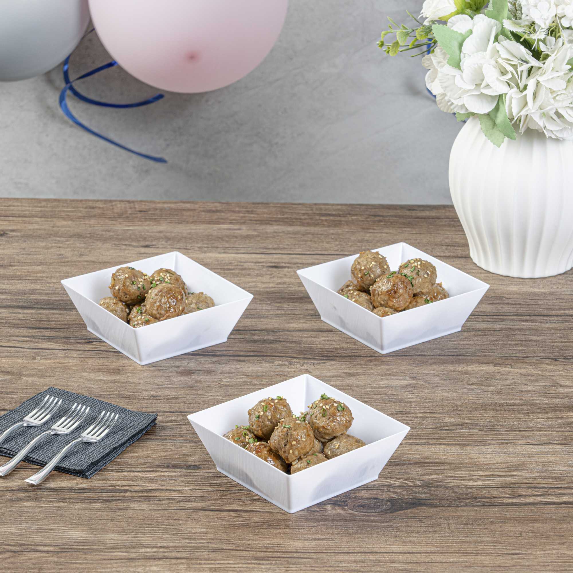 Gracefully present your salads using our Maxi Serve stylish 10-ounce Square White Plastic Small Modern Bowls. These square bowls are crafted from premium plastic and exhibit timeless durability, rendering them perfect for various meal items, whether wet, dry, or cooled, at your upcoming function. Boasting a classy square design, these plastic bowls act as an elegant frame for your servings, amplifying their appeal. These food containers hold up to 10 ounces, making them suitable for individual meal portions. Featuring a pristine white finish, these serving bowls enhance their visual appeal and give a high-end touch to your food presentations. The lightweight make of these disposable bowls guarantees effortless handling and easy usage. These salad bowls are disposable to ensure the cleaning process post-event is a breeze. Each white bowl measures 4.25 inches in length by 4.25 inches in width by 1.5 inches in height and has a capacity of 10 ounces. Shipped in a 100 count box.