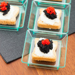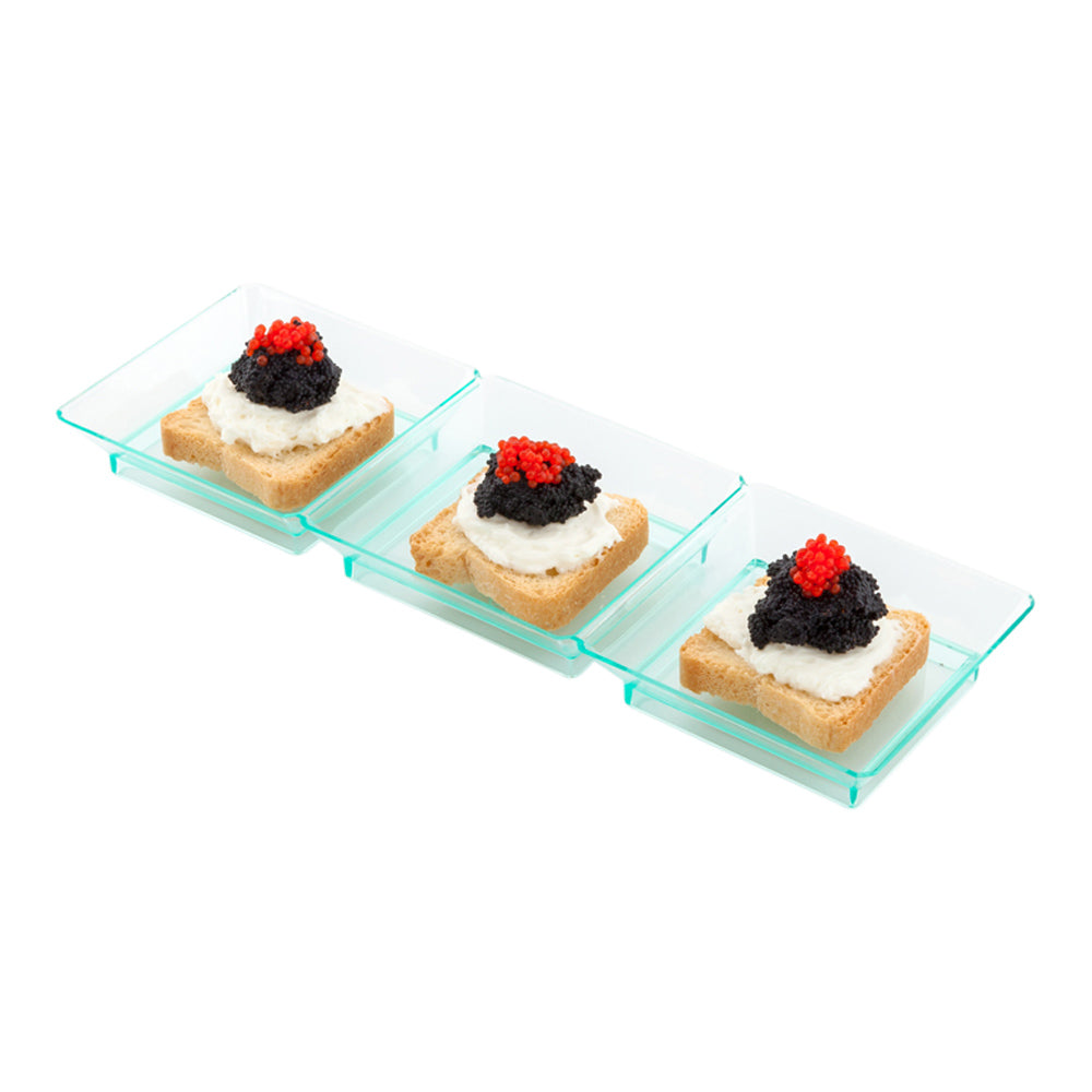 Elevate your miniature appetizer and dessert presentations with our Maxi Serve Rectangle Seagreen Plastic Terzetto Mini Plates with Silver Plastic Mini Forks. Designed with 3 compartments, these serving plates provide functionality and sophistication, making them the perfect choice to display a range of delectable dishes stylishly. Crafted from high-quality PS plastic, these divided plates and tasting forks are disposable, ensuring an easy cleanup at the end of your event. For a convenient take out solution, these appetizer plates can be paired with their matching lids (SKU: RWP0052C). Each rectangle plate has raised edges, providing a practical solution to keeping food separated and enhancing the overall dining experience. The included plastic forks boast a shiny silver finish and robust handles, imparting elegance and durability to your dining ensemble. These compartment plates measure 7.5 inches in length by 2.5 inches in width by 0.5 inches in height, while the included silver plastic forks measure 4 inches in length. Each order includes 100 plates and 100 forks. Lids are available and sold separately.