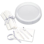 - Cutlery sets include a fork, spoon, knife, and napkin tied together with a silver ribbon for easy setup and added sophistication