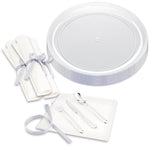 Impress your guests with our Bundle: Maxi Serve Round Clear Plastic Elegant Plates with Moderna Silver Plastic Cutlery Sets, offering a stylish and sustainable solution for your next event. This bundle includes transparent plastic dinner plates and silver plastic cutlery sets, providing a convenient and elegant tableware solution. The durable plastic plates avoid chipping and breakage, ensuring reliability, while their disposable design allows for effortless clean-up after use. Featuring an elegant transparent finish, these plates elevate the ambiance of any catered event, restaurant, or foodservice establishment. Complementing the plates, the silver cutlery sets add a modern touch, with each set featuring a spoon, fork, and knife tied with a white napkin and an elegant silver ribbon. Built from premium plastic, these disposable cutlery sets allow customers to enjoy meals without messes. The plates measure 9 inches in diameter, providing ample space for serving various dishes. Each order includes 100 plastic plates and 100 cutlery sets.