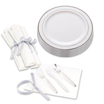 100 PLASTIC ROUND WHITE SILVER-RIMMED PLATES AND 100 CUTLERY SETS