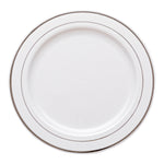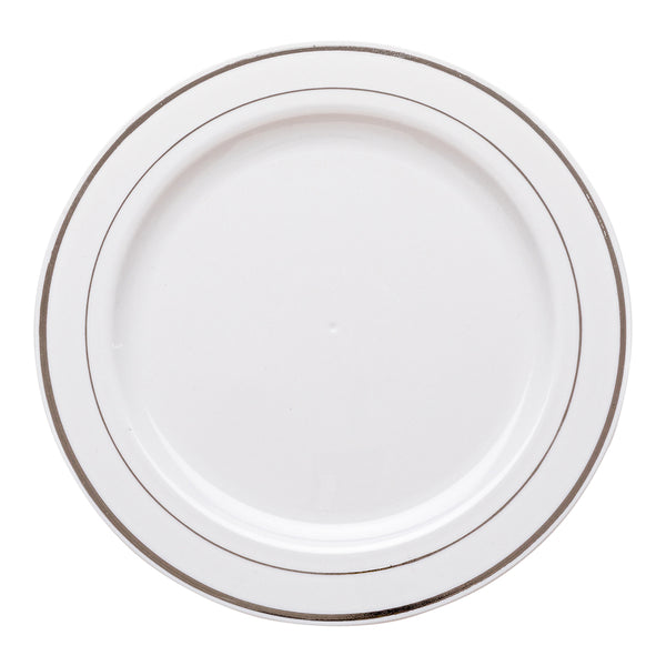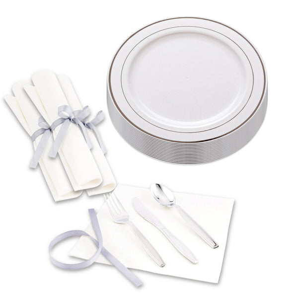 Elevate your event with our Bundle: Maxi Serve Round White Plastic Silver-Rimmed Plates with Argento Silver Plastic Cutlery Sets. This bundle features 100 sophisticated white plastic plates adorned with a sleek silver rim and 100 matching silver plastic cutlery sets, each including a spoon, fork, and knife elegantly tied with a silver ribbon. Made from plastic, both the plates and cutlery are robust and reliable, designed to handle the demands of any catering or foodservice occasion. The white plates with their silver rim add a touch of elegance to your presentations, making them perfect for upscale events like weddings, restaurant dinners, or gala banquets. The cutlery sets, wrapped in premium napkins, help your guests dine without any mess. With the disposable nature of these plates and cutlery sets, they ensure quick and easy cleanup. The plates measure 7.5 inches in diameter, ideal for serving desserts and appetizers. Each order includes 100 plastic plates and 100 cutlery sets.