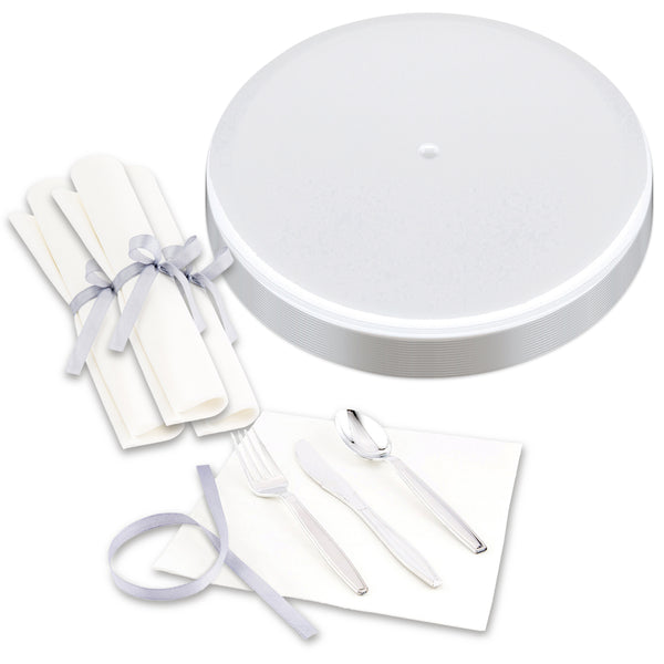 Simplify your event planning with our Bundle: Maxi Serve Round White Plastic Elegant Plates and Argento Silver Plastic Cutlery Sets, delivering a chic solution for any gathering. This bundle includes 100 round white plastic plates and 100 silver plastic cutlery sets, offering a complete dining set for your guests. The white plastic plates feature a refined finish, adding elegance to any catered event, restaurant, or foodservice setting while ensuring strength. Designed to avoid chipping and breaking, these durable plates are ideal for single-use occasions. The silver cutlery sets, each including a spoon, fork, and knife, enhance the presentation of your meals. Each set is wrapped in a white napkin and tied with a sleek silver ribbon, providing a modern touch for cafés, restaurants, and catering events. Made from plastic, these disposable plates and cutlery sets allow for effortless clean-up after use. The plates are 9 inches in diameter, offering ample space for your dishes. Each order includes 100 plastic plates and 100 cutlery sets.