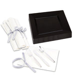 - Cutlery sets include a fork, spoon, knife, and napkin tied together with a silver ribbon for easy setup and added sophistication