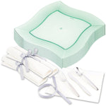 Serve your guests with ease using our Bundle: Maxi Serve Square Seagreen Plastic Large Aqua Plates and Argento Silver Plastic Cutlery Sets, providing a chic and refined solution for your dining presentations. This set features 100 premium plastic square plates in a seagreen color that elegantly highlights your dishes, and 100 plastic cutlery sets adorned with a sophisticated silver ribbon for an added touch of class. The stylish plates come with wavy edges and a durable, shatterproof design, offering a refined look while ensuring reliability throughout service. Their lightweight nature makes them easy for servers to handle and clear away. The cutlery sets include a spoon, fork, and knife wrapped in a premium napkin, ensuring guests can dine comfortably and cleanly. Made from disposable plastic, these plates and cutlery sets offer the convenience of effortless cleanup. The plates measure 9 inches in height and width and are ideal for serving and showcasing your culinary delights. Each order includes 100 plastic plates and 100 cutlery sets.