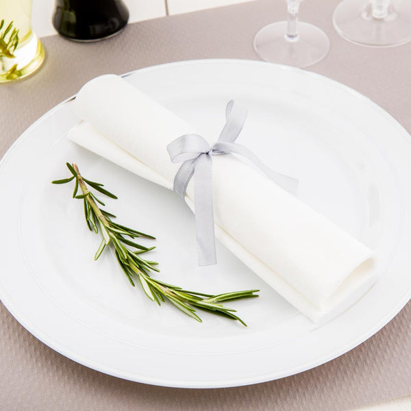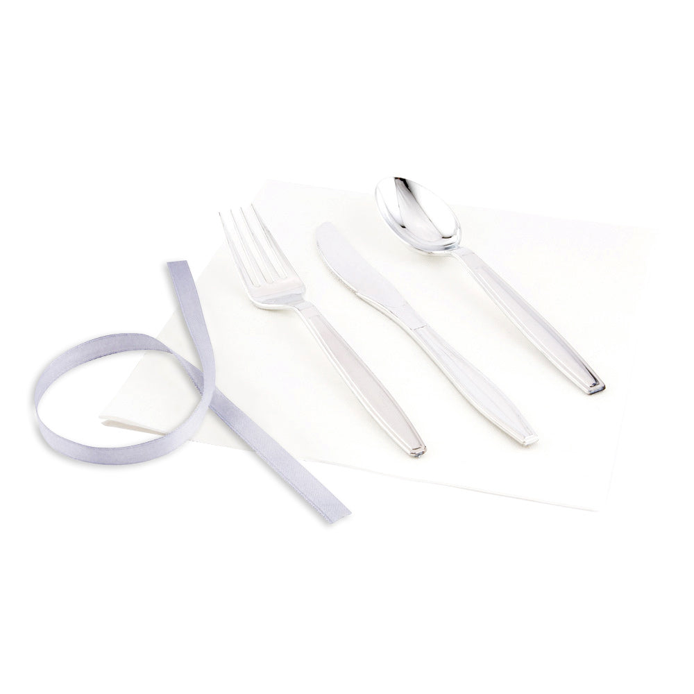 - Cutlery sets include a fork, spoon, knife, and napkin tied together with a silver ribbon for easy setup and added sophistication