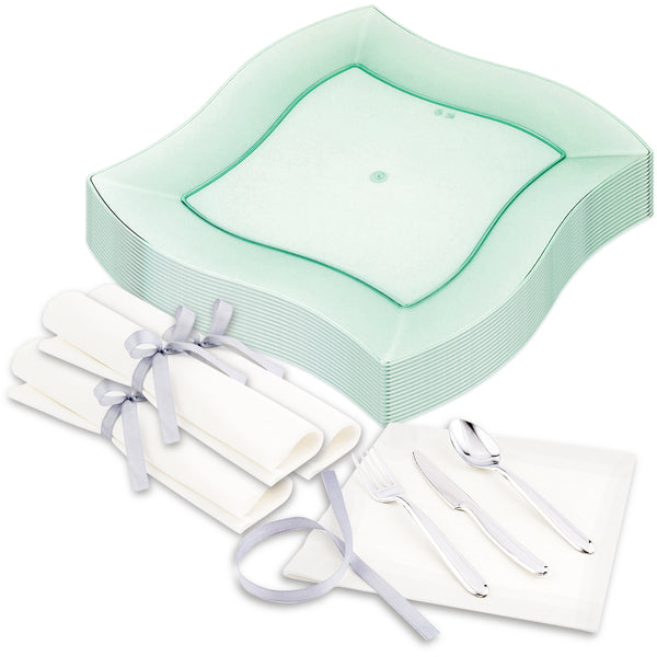 Serve guests quickly with our Bundle: Maxi Serve Square Seagreen Plastic Large Aqua Plates with Moderna Silver Plastic Cutlery Sets, offering a modern and elegant solution for your culinary presentations. This bundle includes 100 premium plastic square plates with a seagreen hue that beautifully showcases your dishes, and 100 plastic cutlery sets tied with an elegant silver ribbon, adding a touch of sophistication to any meal. The clear plates boast wavy edges and a shatterproof construction, providing an upscale appeal while ensuring sturdiness during service. Light in weight, these plates make serving and bussing tables a breeze for waiters and waitresses. The premium plastic cutlery sets feature a spoon, fork, and knife wrapped in a napkin, allowing customers to enjoy with clean hands. Built from disposable plastic, these plates and cutlery sets offer convenience and easy cleanup after use. The plates measure 9 inches in length and width, providing ample space for presenting and enjoying your culinary creations. Each order includes 100 plastic plates and 100 cutlery sets.