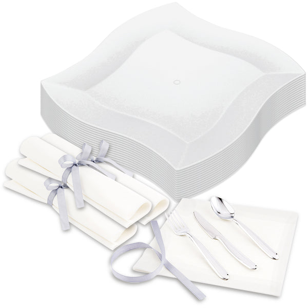 Keep things simple and stylish on your special occasion with our Bundle: Maxi Serve Square White Plastic Large Aqua Plates with Moderna Silver Plastic Cutlery Sets, providing an elegant and convenient tableware solution. This bundle includes 100 white square plastic plates and 100 plastic silverware sets, offering a complete dining set for any occasion. The curved edges on these square plastic plates present an elegant style table setting, worthy of both casual and fine dining occasions. With a sturdy build, these plates can hold prime ribs, pork medallions, lamb chops, and more without chipping or cracking. The durable and lightweight design of these disposable plates makes them easy to store and travel with, perfect for caterers. The chic-looking plates will not shatter, allowing you to stack them next to delicious buffet spreads or serve entrees on them for an aesthetically mouth-watering plating presentation. Complementing the plates, the silver cutlery sets feature a spoon, fork, knife, and napkin in each set, tied with an elegant silver ribbon, adding a modern touch to your café, restaurant, or catering event. Built from premium plastic, these disposable cutlery sets are wrapped in napkins, allowing customers to enjoy meals without any mess. Each plate measures 9 inches in length and 9 inches in width. Every order includes 100 plastic plates and 100 cutlery sets.