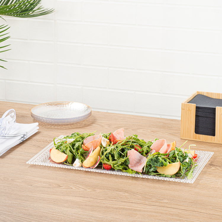 Elevate your dining experience with sophisticated presentation and hassle-free service. Maxi Serve Shatterproof Plastic Dinner Plates feature a charming lace rim edge that enhances food presentation, making every meal a visual delight. Crafted from shatterproof plastic, these plates ensure outdoor events proceed without the worry of breakage, offering peace of mind with every use. Their disposable nature effortlessly streamlines cleanup in busy kitchens, allowing staff to focus on what's important: serving guests. Measuring 16.9 inches in length and 9.1 inches in width, these plates provide ample space for main courses, perfectly accommodating the demands of high-volume foodservice settings. These clear plastic dinner plates are ideal for weddings, banquets, and catering events, providing a reliable solution that combines elegance with practicality. Each order includes 25 Maxi Serve Shatterproof Plastic Dinner Plates.