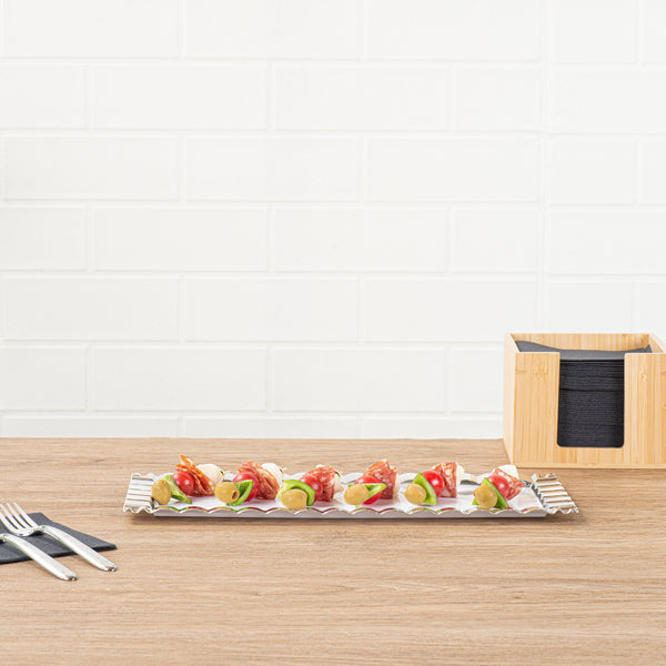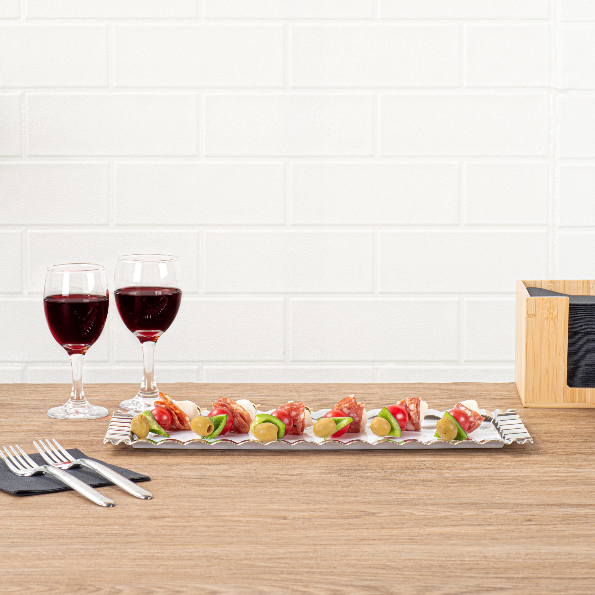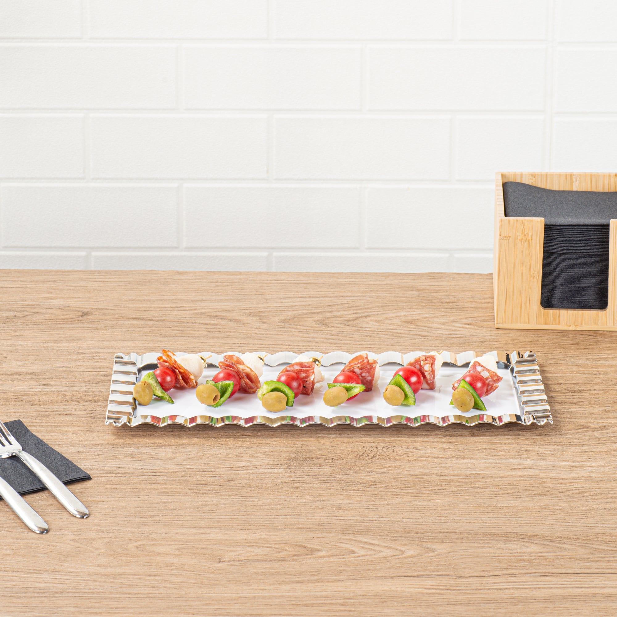 Enhance your food service efficiency and presentation with ease. Maxi Serve Shatterproof Plastic Serving Plates showcase a striking silver ruffled rim edge that elevates dish presentation, making these plastic serving plates ideal for any culinary masterpiece. Constructed from shatterproof plastic, these plates ensure safety and reliability at outdoor events, eliminating the worry of breakage and allowing you to focus on serving your guests. The disposable party plates provide the added benefit of effortless cleanup, streamlining operations in bustling settings and allowing staff to maximize efficiency. Measuring 14.17 inches in length and 6.18 inches in width, these cold food-friendly plates perfectly accommodate a variety of dishes for versatile use. The white color complements any food presentation, enhancing the overall dining experience. Improve your service with these shatterproof plates, designed to meet the demands of fast-paced environments. Sold in a 100 count box.