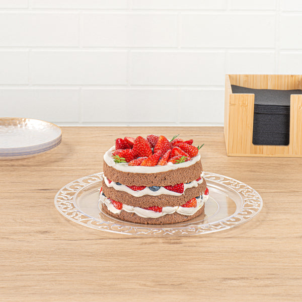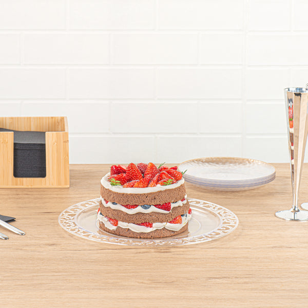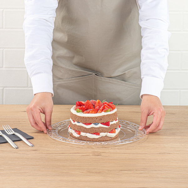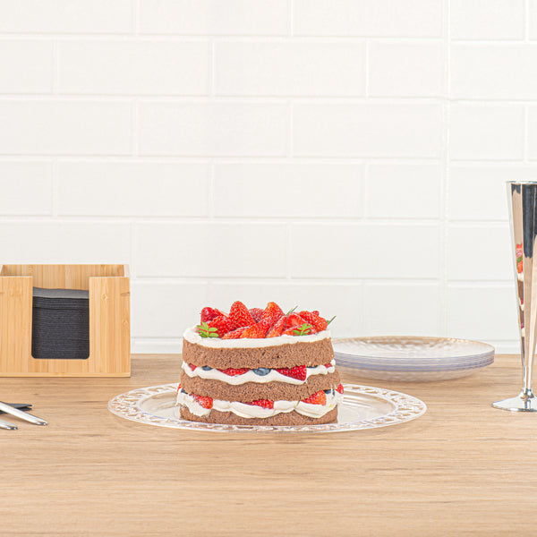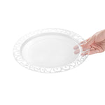 Enhance your dining experience with effortless elegance. Maxi Serve Lace Rim Plastic Disposable Plates feature a stunning lace rim edge that elevates food presentation, impressing diners at every event. Made from clear plastic, these plates offer the sophisticated appearance of glass while being shatterproof, ensuring safe and smooth service at outdoor events without the fear of breakage. Measuring 11.7 inches in length and width, they provide ample space for various culinary creations. The disposable convenience of these clear plastic plates streamlines cleanup, boosting operational efficiency in fast-paced settings, which is especially beneficial for catering services seeking reliable plastic disposable plates. Elevate your service and ensure customer satisfaction by selecting these expertly crafted plates for your next event. Each order includes 100 Maxi Serve Lace Rim Plastic Disposable Plates.