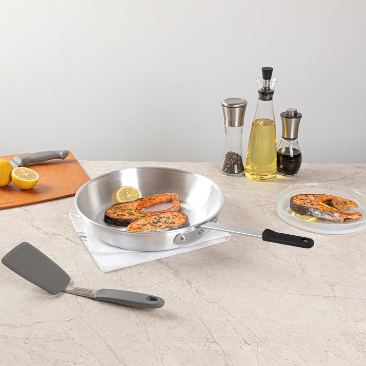 Elevate your cooking experience with our Bundle: Met Lux 1 Aluminum 12" Fry Pan with 1 Black Silicone Pan Handle Sleeve. This frying pan is made from robust 3.5 mm thick aluminum, ensuring long-lasting durability and superior heat distribution for perfectly cooked meals every time. Impressively lightweight, this aluminum fry pan allows for easy maneuvering, making flipping or stirring your dishes a breeze. The satin finish on this cooking pan excels at searing and browning, giving your dishes a professional touch. Equipped with a triple-riveted handle, this skillet pan provides a comfortable grip for safe handling. The convenient hanging hole of this aluminum pan makes it easy to store and saves valuable kitchen space. For optimal care and maintenance, hand washing this aluminum skillets is recommended. With a heat resistance of up to 450F, this removable handle sleeve ensures the safe handling of pan, even when they're blazing hot. Featuring molded indentations, this silicone sleeve offers a firm and secure grip, giving you full control while frying or sauteing. The removable design of this pan handle sleeve provides added convenience by allowing easy attachment and removal. This aluminum frying pan measures 22.24 inches in length by 11.81 inches in width by 3.94 inches in height. Each order includes 1 pan and 1 sleeve.