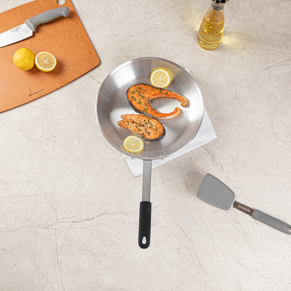 - Triple-riveted handle provides a secure grip and improved control while cooking