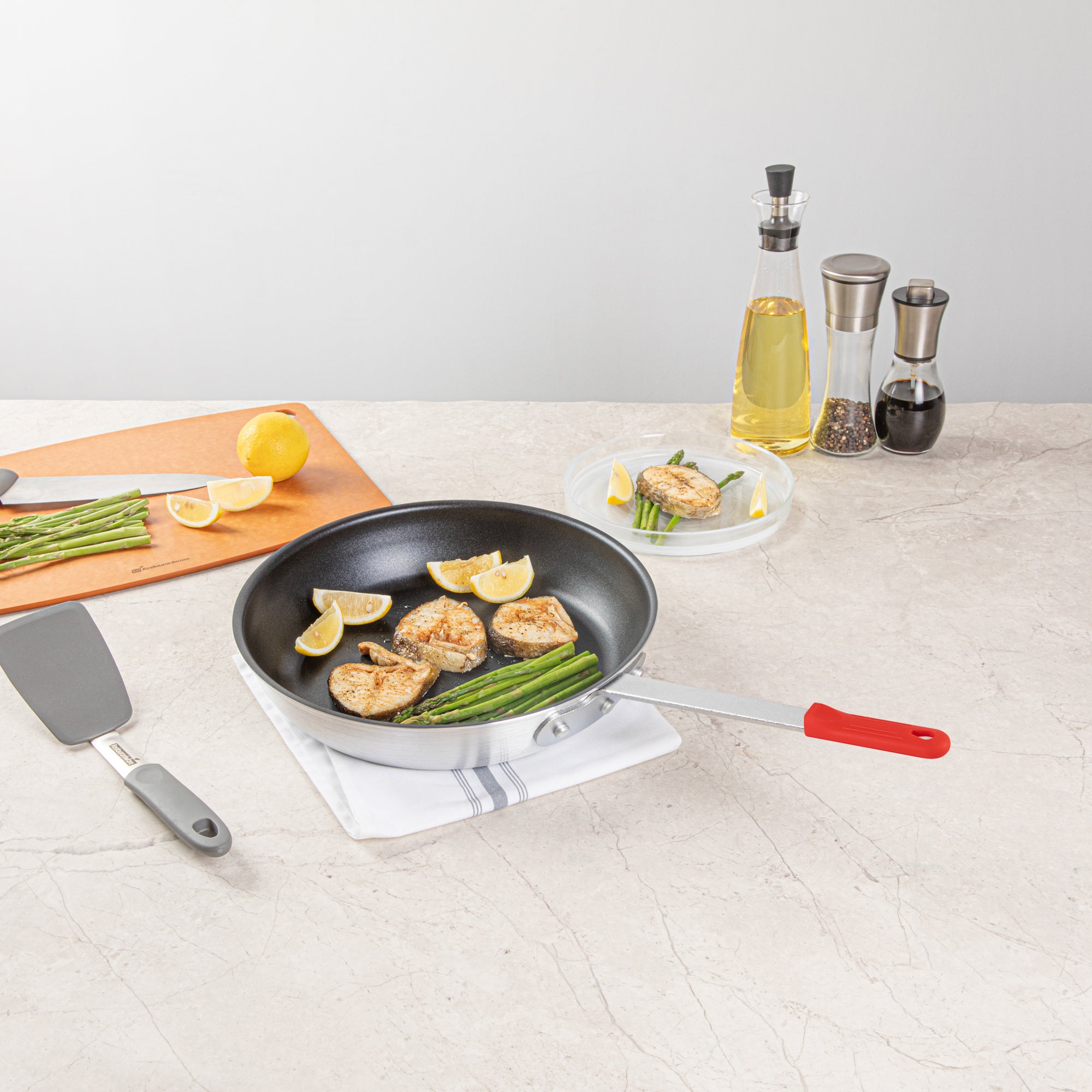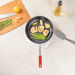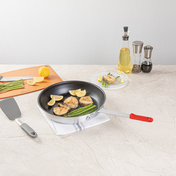 Elevate your kitchen efficiency and safety with our Bundle: Met Lux 1 Aluminum 12" Non-Stick Fry Pan with 1 Red Silicone Pan Handle Sleeve. This aluminum fry pan is non-stick and prevents food from sticking, making cooking and cleanup effortless. Crafted from 3 mm thick aluminum, this non-stick fry pan provides excellent heat distribution for even cooking, ensuring consistent results every time. Designed to be induction-ready, this aluminum pan opens up a world of versatile cooking options, allowing you to use them on various stovetops. Featuring a triple-riveted handle, this frying pan offers a secure grip, enhancing the ease and comfort of your cooking experience. With a convenient hanging hole, this aluminum skillet provides an efficient storage solution for crowded kitchen spaces, helping you maintain an organized cooking area. To preserve its premium non-stick surface, this skillet pan is hand washable only, ensuring long-lasting performance. This pan handle sleeve is heat-resistant up to 450F and protects your hands from burns. The molded indentations of this removable handle sleeve offer a secure grip and enhanced comfort while handling hot pan. With a removable design, this red pan handle sleeve is easy to attach and detach, allowing for quick pan transitions and enhanced kitchen efficiency. Measuring 22.24 inches in length by 11.81 inches in width by 3.94 in height, this aluminum saute pan offers ample cooking space for your culinary creations. Each order includes 1 pan and 1 sleeve.