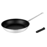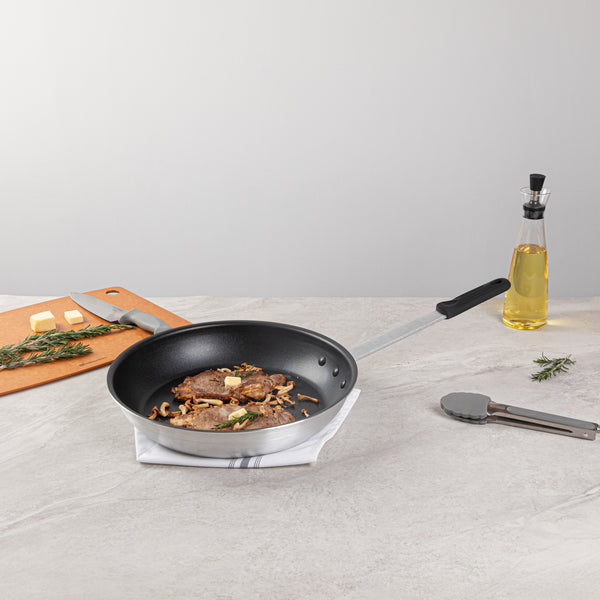 Upgrade your kitchen operations with our Bundle: Met Lux 1 Aluminum 14" Non-Stick Fry Pan with 1 Black Silicone Pan Handle Sleeve. This frying pan is non-stick and ensures that your delectable dishes slide right off the surface. Made from 3 mm thick aluminum, this skillet pan provides even distribution throughout its surface for consistently cooked meals. Designed to be induction-ready, this aluminum fry pan effortlessly integrates into your kitchen cookware collection, allowing for versatile cooking methods. The triple-riveted handle of this kitchen skillet provides superior stability and durability for confident cooking. Equipped with a hanging hole, this aluminum pan offers convenient storage, optimizing your kitchen space. To preserve their non-stick coating and overall appearance, this cooking pan is hand washable only, ensuring long-lasting use. This pan handle sleeve is heat-resistant up to 450F and protects your hands from burns while handling hot pan, enhancing safety in the kitchen. Featuring molded indentations, this removable handle sleeve ensures a firm and secure grip, giving you enhanced control while cooking. The removable design of this silicone sleeve allows for versatile use across multiple pans, making it a practical addition to your cooking routine. This aluminum skillet pan measures 25.98 inches in length by 14.17 inches in width by 6.38 inches in height, offering ample space for preparing a wide variety of dishes. Each order includes 1 pan and 1 sleeve.
