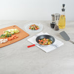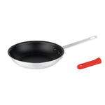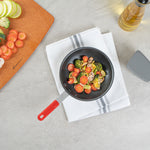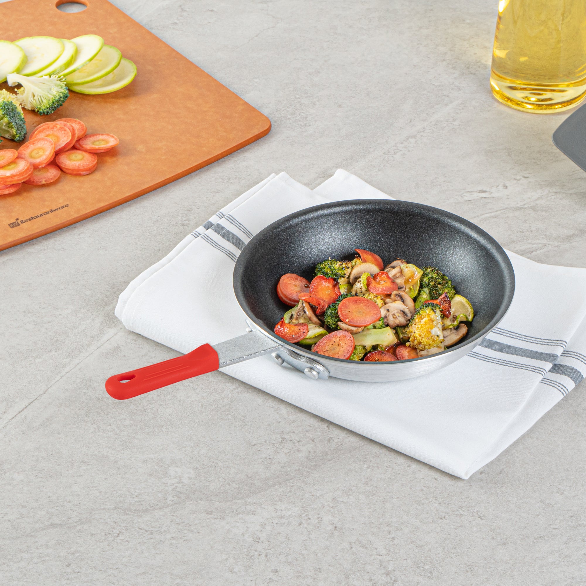 Elevate your kitchen efficiency with our Bundle: Met Lux 1 Aluminum 7" Non-Stick Fry Pan with 1 Red Silicone Pan Handle Sleeve. This frying pan is non-stick and ensures that your dishes release effortlessly and cook evenly, providing an exceptional cooking experience. Crafted from 3 mm thick aluminum, this skillet pan provides quick and efficient heat distribution, delivering consistent results every time. The sturdy, triple-riveted handle on this aluminum fry pan offers a secure grip and enhanced durability for long-lasting use. This fry pan is induction-ready, expanding its versatility across different cooking surfaces. Featuring a convenient hanging hole, this cooking pan allows for easy storage and accessibility within your kitchen. To maintain their pristine look, hand washing this non-stick pan is recommended. Capable of withstanding heat temperatures up to 450F, this pan handle sleeve protects your hands from burns, ensuring safe handling of hot cookware. With a removable design, this silicone sleeve allows for easy interchangeability between different pans, increasing kitchen efficiency and reducing clutter. The molded indentations on this removable handle sleeve provide a secure grip, minimizing accidental slippage while maneuvering your pans. Measuring 12.99 inches in length by 7.56 inches in width by 2.28 inches in height, this aluminum cooking pan provides ample space for a variety of culinary creations. Each order includes 1 pan and 1 sleeve.