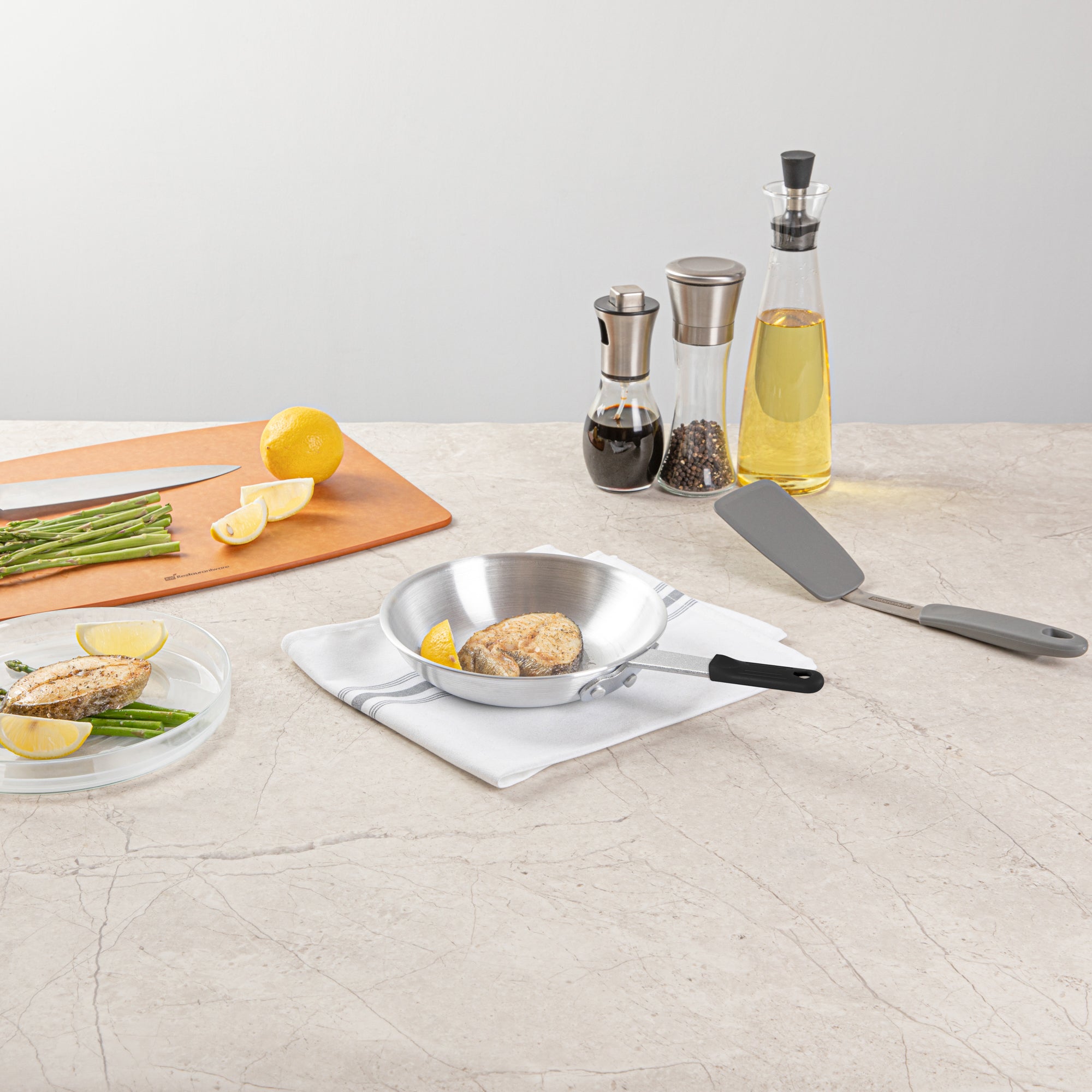 - Triple-riveted handle provides a secure grip and improved control while cooking
