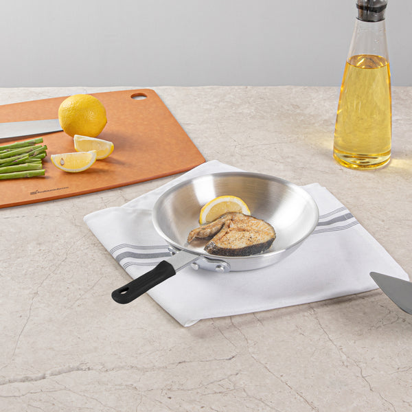 Make blueberry pancakes with our Bundle: Met Lux 1 Aluminum 8" Fry Pan with 1 Black Silicone Pan Handle Sleeve. Crafted from 3.5 mm thick aluminum, this fry pan ensures even heat distribution for consistent cooking results. The lightweight design of this aluminum pan allows for easy flipping, stirring, and sauteing, reducing strain during extended cooking sessions. Featuring a satin finish, this skillet pan is excellent for searing, sauteing, and browning food, enhancing the flavor and presentation of your dishes. The triple-riveted handle of this frying pan provides a secure and comfortable grip, ensuring stability and control while cooking. With a convenient hanging hole on each handle, this aluminum fry pan allows for easy storage and accessibility, optimizing kitchen space. This aluminum skillet is designed for hand washing to ensure longevity and maintain optimal performance. With the ability to withstand temperatures up to 450F, this pan handle sleeve is durable and reliable in high-temperature cooking environments. The molded indentations in this silicone handle sleeve offer a secure and comfortable grip, reducing the risk of accidents or spills during peak service times. Each removable handle sleeve allows easy switching between pans without the risk of burns or discomfort. This aluminum cooking pan measures 12.99 inches in length by 7.87 inches in width by 2.28 inches in height, offering ample space for frying various ingredients. Each order includes 1 pan and 1 sleeve.